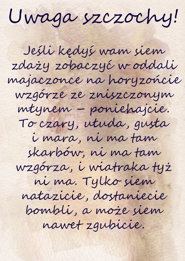 , sugeruje że nie jest to oficjalny komunikat wychodzący od oficerów. Jak dotąd tylko porucznik zwracał się tak do graczy, a i on robi to, bo tak się przyjęło, a on jako stary żołnierz szybko przyjmuje żołnierskie zachowania. W oficjalnych komunikatach, szczególnie na piśmie, żaden oficer nie użyłby nieformalnej nazwy stopnia. Zresztą abstrahując od tego, wystarczy spojrzeć na zmasakrowaną ortografię całej notki, aby szybko zorientować się, że jej autorem jest ktoś ledwie piśmienny, kto najpewniej zapragnął zadrwić sobie z nowych obozowiczów. Jej treść jest ewidentną podpuchą – mowa tam o skarbach, ale wg zapewnień, nieistniejących. Podobnie jak sam wiatrak, który jednakowoż jest widoczny i całkowicie osiągalny – więc skoro tu jest jawna nieprawda, to większość graczy zapragnie sprawdzić także, czy wspominane skarby nie są podobnie realne. Zresztą i tak będą działać w myśl zasady – Jeśli ktoś nie chce, abyśmy tam poszli, to koniecznie musimy tam iść