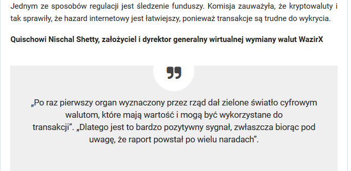 Jak podaje indyjski dziennik New Indian Express rząd w Indiach ma wydać wytyczne dotyczące kryptowalut do września br. Posiłkuje się przy tym wypowiedziami jednego z pracowników lokalnego Ministerstwa Finansów. Konsultacje pomiędzy różnymi instytucjami (m.in. Bankiem Centralnym Indii) miały się rozpocząć już w lipcu. Równocześnie w Sądzie Najwyższym toczą się postępowania w sprawie zakazu handlowania i używania kryptowalut. Wyniki ich mają zostać ogłoszone...również we wrześniu.