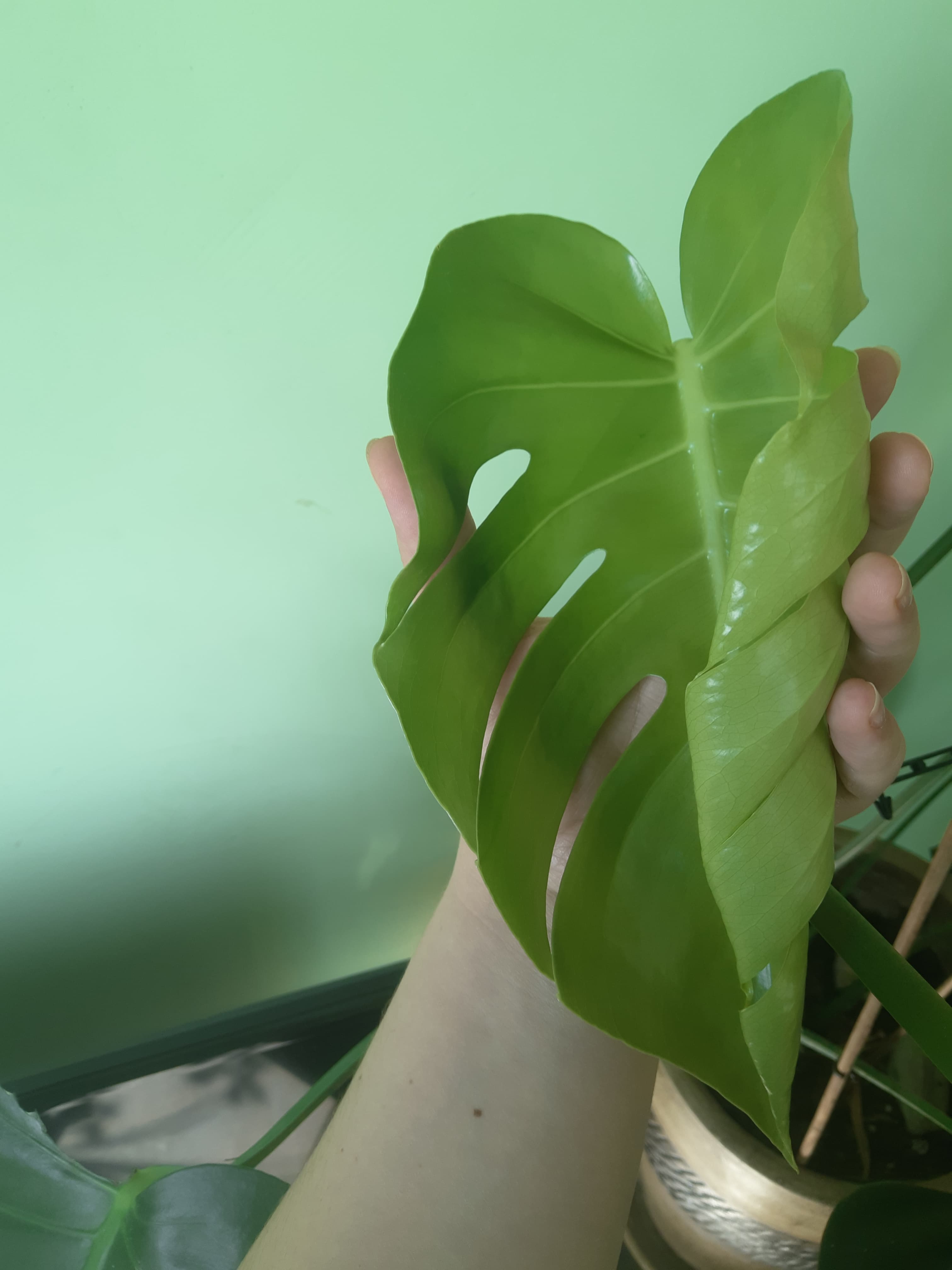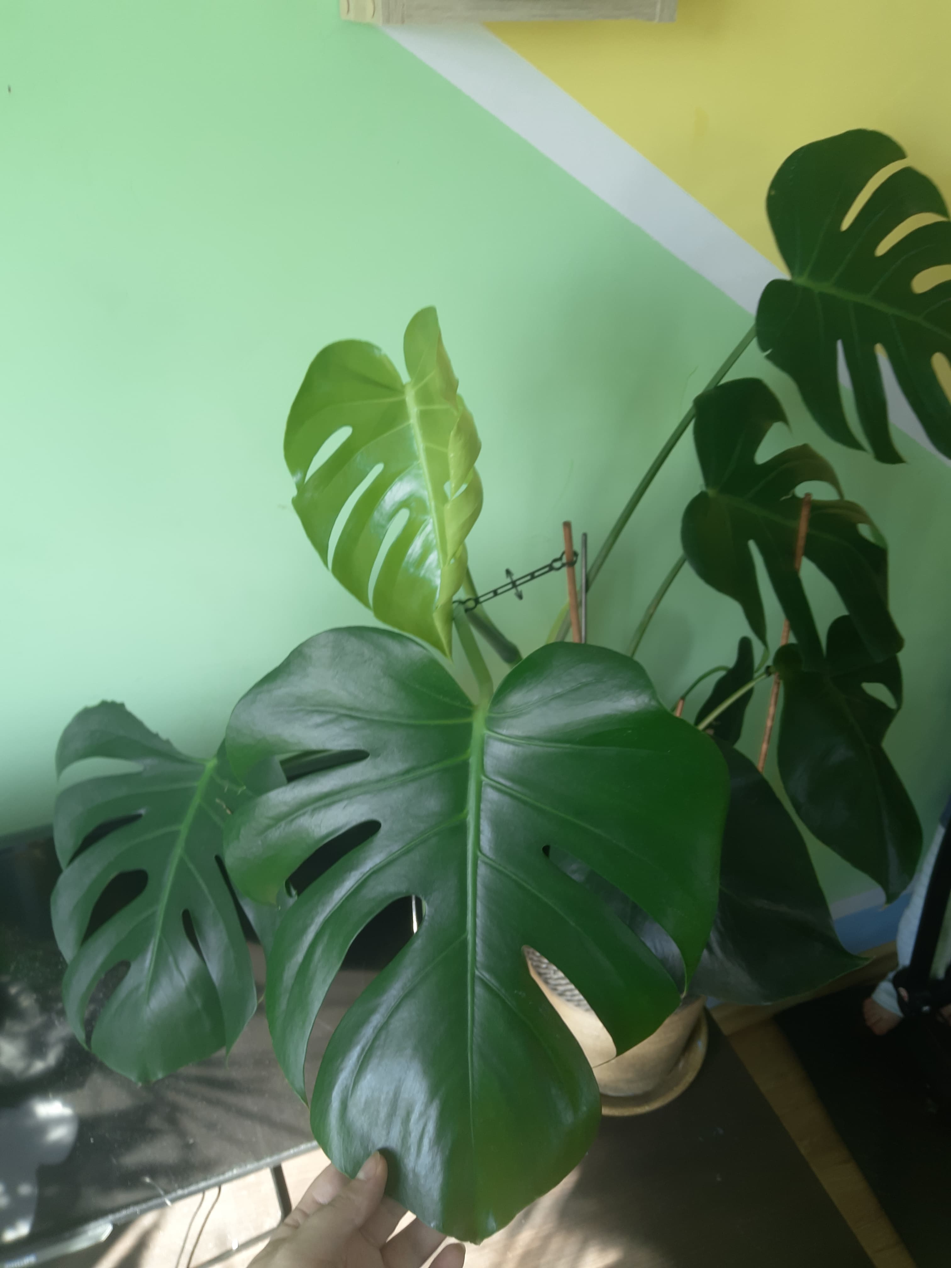 Mój własny okaz ma około roku i już jest największym kwiatkiem doniczkowym w moim mieszkaniu. Pielęgnacja monstery nie jest trudna, wystarczy jej podlewanie raz w tygodniu, nawożenie raz na dwa tygodnie i odpowiednie, nie wystawione bezpośrednio na promienie słoneczne, miejsce.🌞 Raz na dwa - trzy miesiące monstera rozwija nowy liść, który na początku wygląda jak jasnozielony rulon a później rozwija się i ciemnieje.