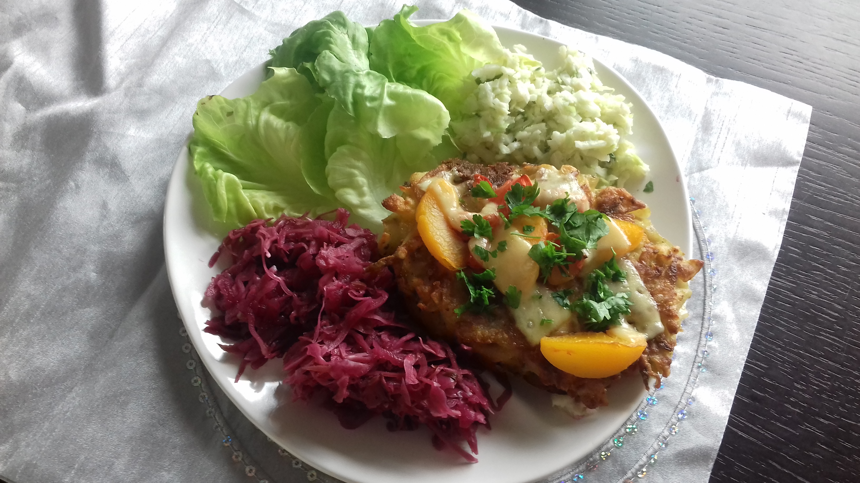 Następnie do żaroodpornego naczynia przekładamy placki ,kroimy w kostkę pomidora i brzoskwinie w pół księżyce ,posypujemy startym serem( 10 dkg).