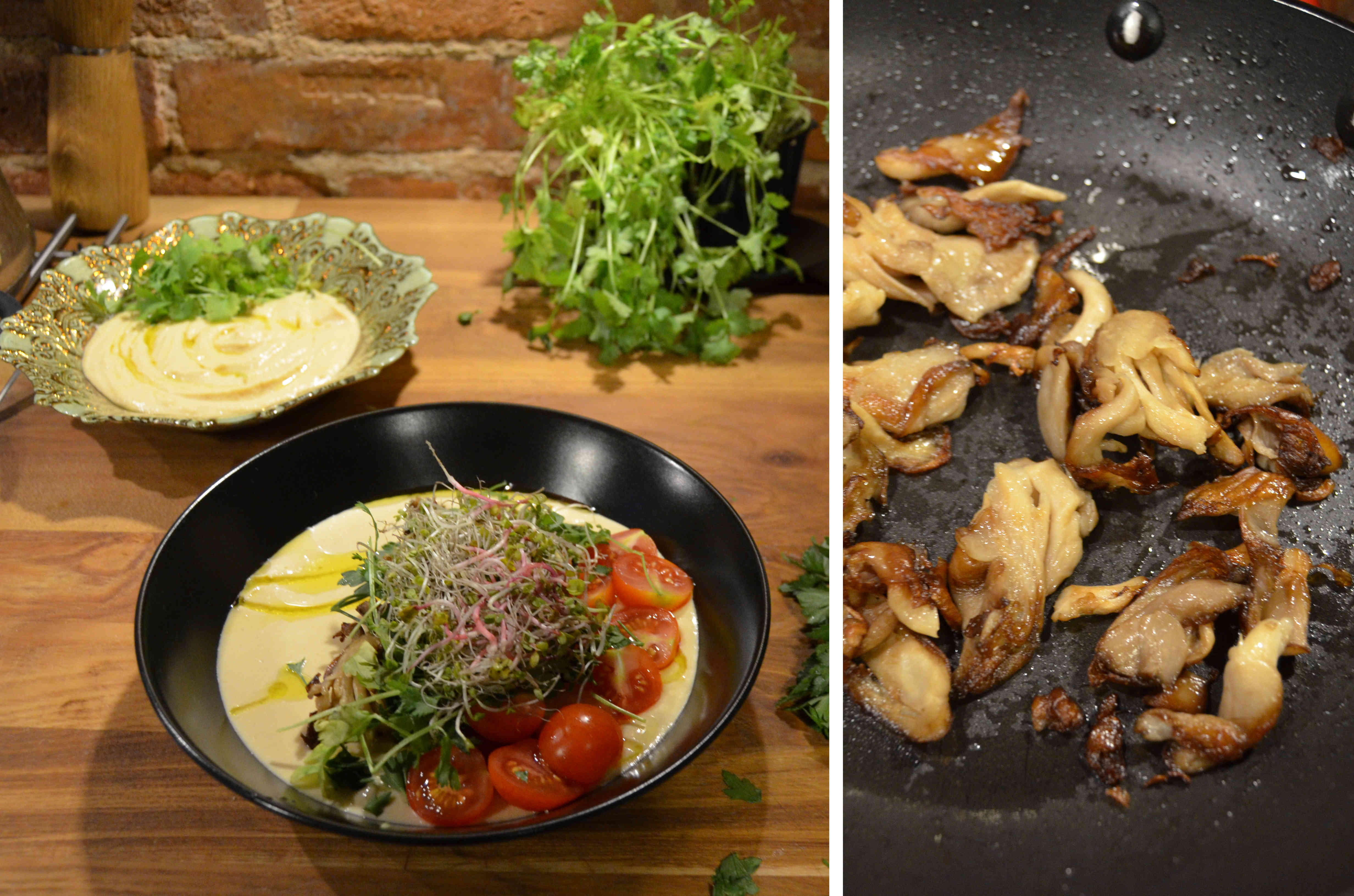 Do tak powstałego dipu tahini dodajemy ciecierzycę i mielimy. Tutaj też zależy wiele od naszych upodobań. Humus może przybrać postać pasty do smarowania pity lub formę lejącą do polania poszatkowanej sałaty. Tekstura może być grudkowata lub aksamitna. Wszystko zależy od tego ile dodamy wody z ciecierzycy i jak długo będziemy mielić. Zrobiłem dwie wersje jedną klasyczna do zjedzenia z pitą, druga z smażonymi boczniakami, pomidorami i kiełkami.