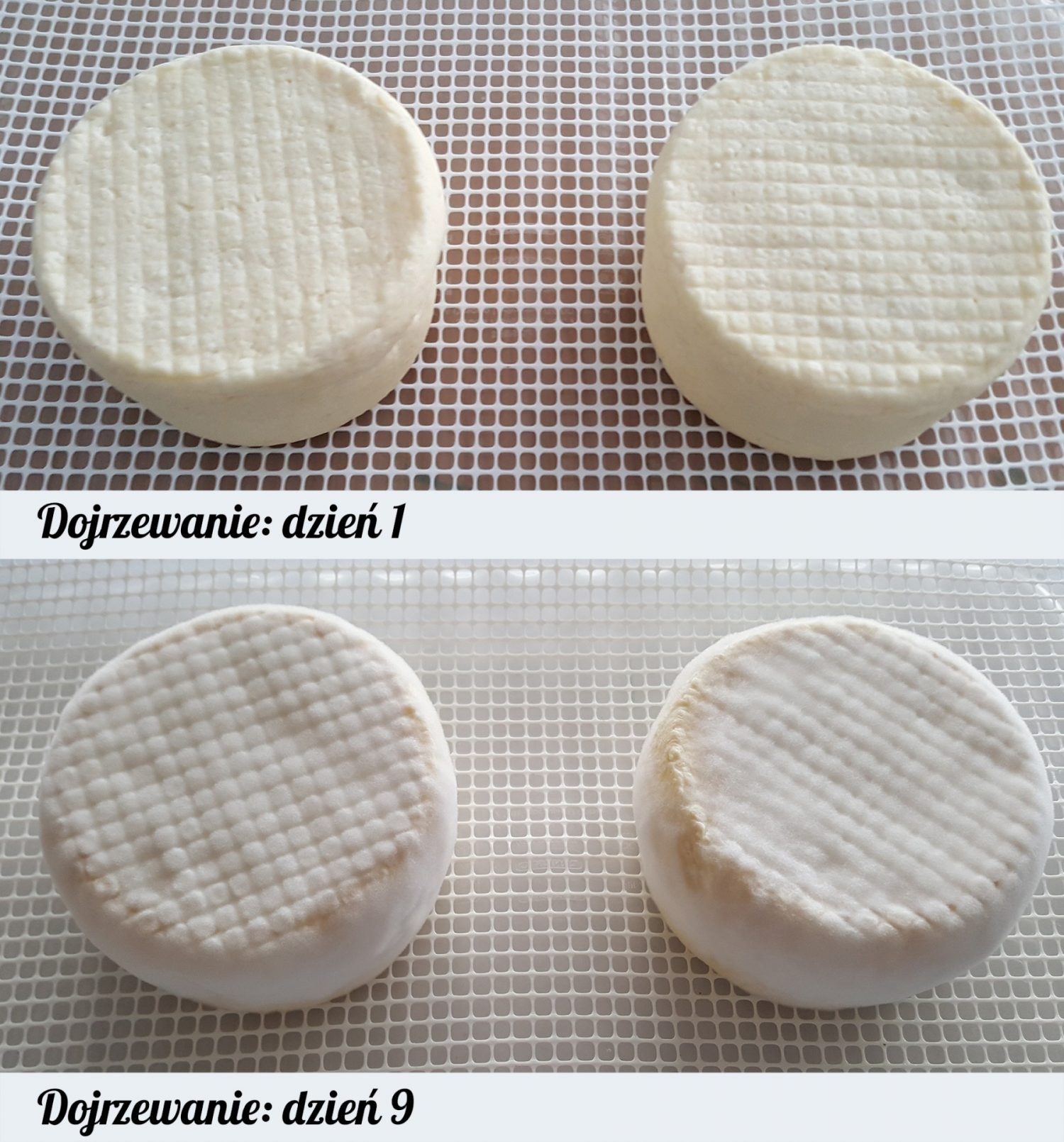 Nasze serki w stylu Camembert przekładamy do pojemnika w którym będą dojrzewały przez 2 tygodnie. W tym czasie pleśń całkowicie porośnie nasze 2 krążki. Pierwsza pleśń powinna się pojawić już po około 3-4 dniach. Pamiętaj aby regularnie obracać sery.