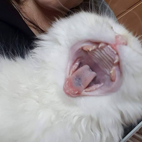 Jak widać na zdjęciu jest cały biały, jego jedynym charakterystycznym znakiem jest czarna plamka na środku języka.