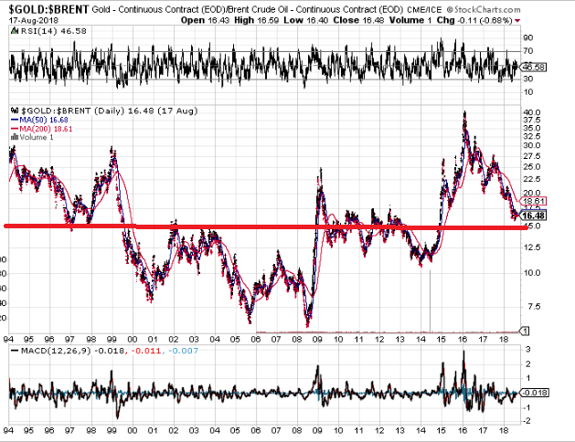 There is some fluctuation in this chart. The gold/oil ratio hit a high of 40 barrels per ounce in 2016 and a low of about seven barrels per ounce in 2005 and 2008. But what is clear from this chart is that the price is range-bound. Over the long-run, 1 oz. gold stays most of the time at around 15-16 barrels per ounce.