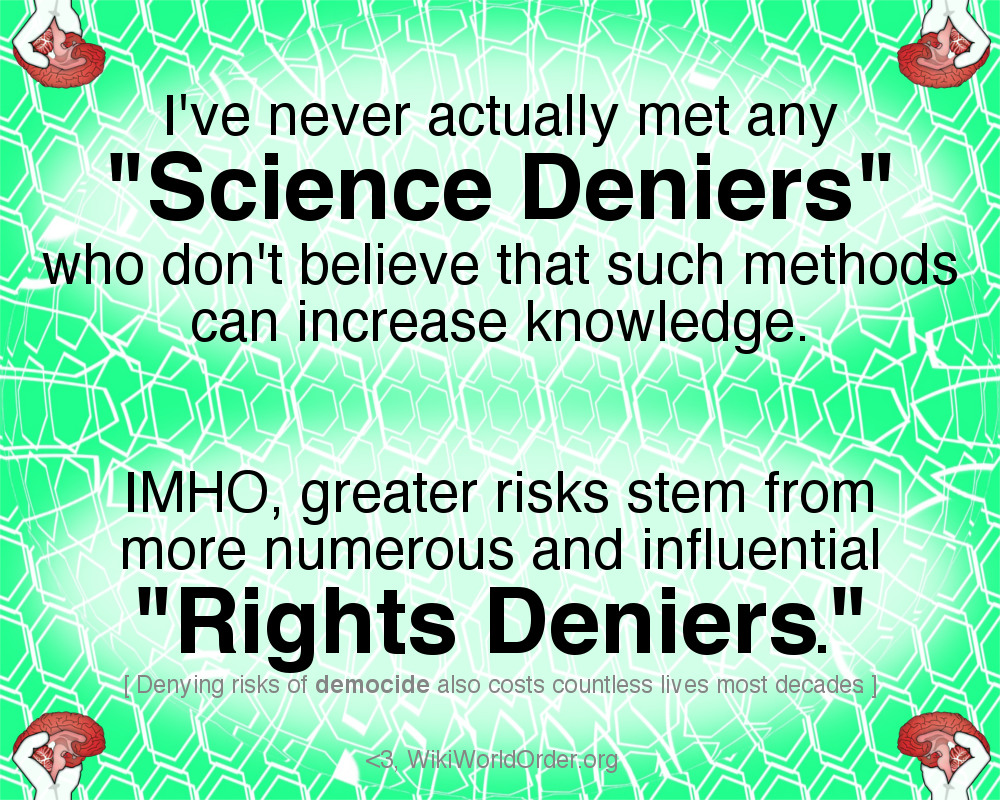 I’ve never actually met any “Science Deniers” who don’t believe that such methods can increase knowledge. IMHO, greater risks stem from more numerous and influential “Rights Deniers.” [Denying risks of democide also costs countless lives most decades.]