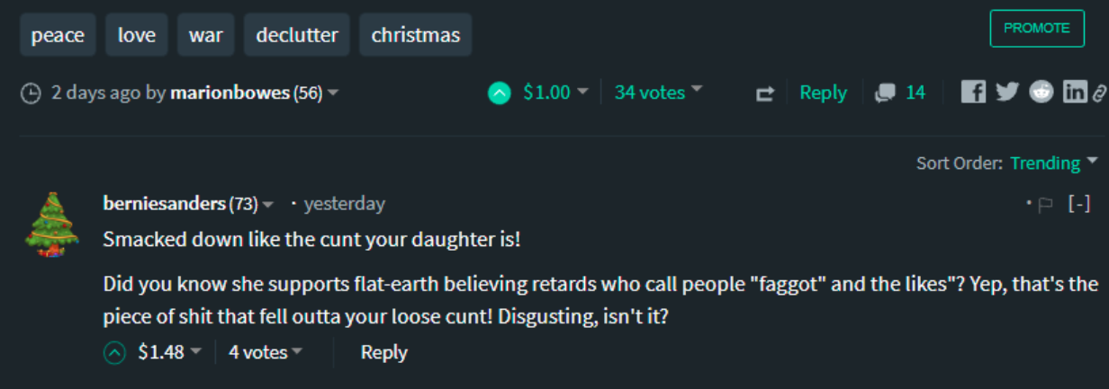 It became obvious to me what was going on when I saw those Christmas bot upvotes. The propaganda/terror machine is alive and well here at Steem.