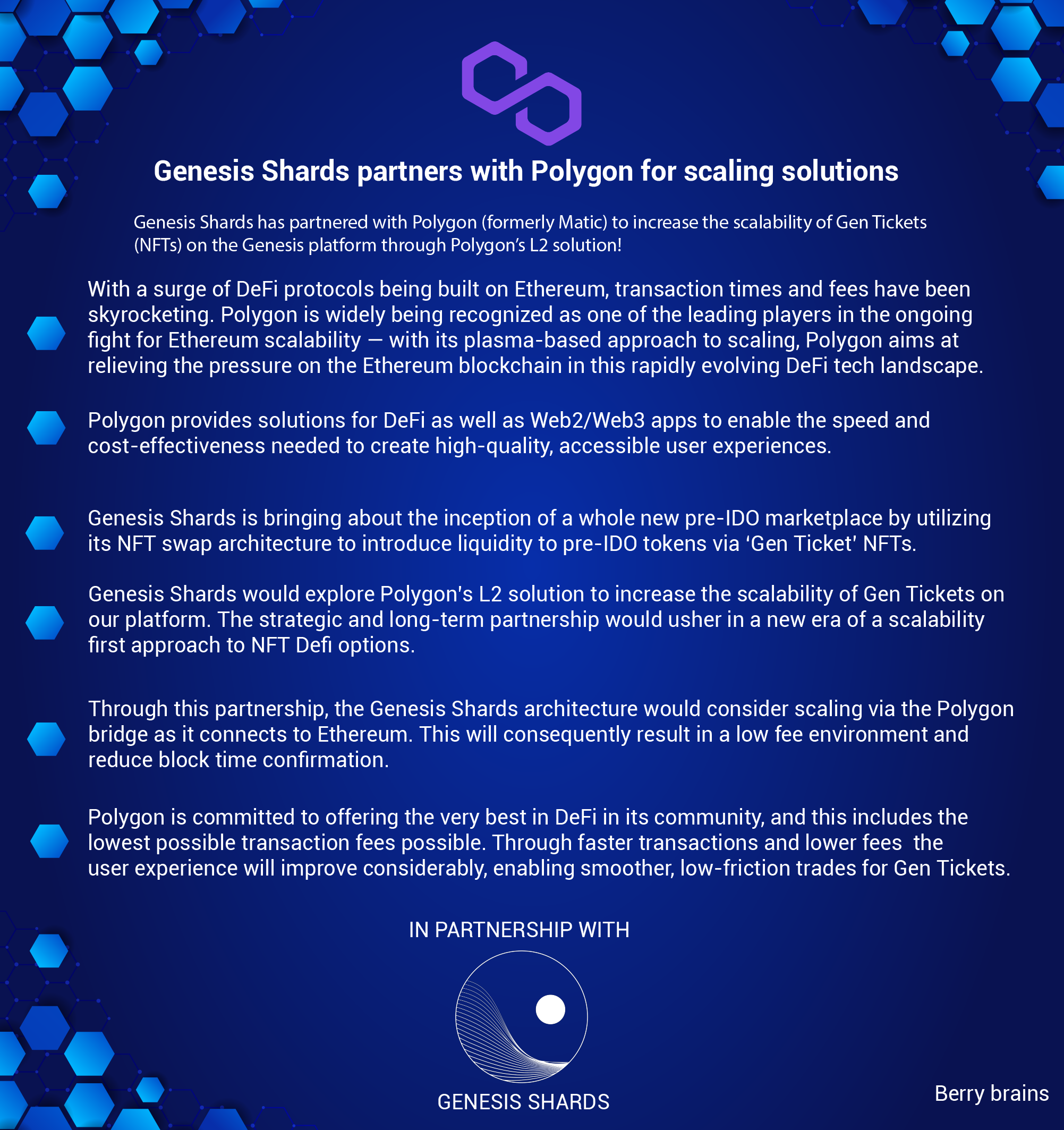 Polygon in partnership with Genesis Shardsberrybrains (25)in #polygondefi • 5 years ago Polygon is in collaboration with GenShards, a PRE-IDO token platform that uses NFTs Projects built on Polygon gets access to the top-tier Genesis Partner network. Learn more in the attached infographic!