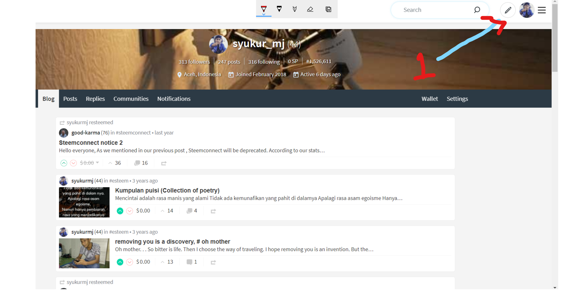 kalian bisa melihat pensil di pojok kanan,pas di samping foto profil kalian,atau lebih tepat nya di gambar yang saya lingkari, dengan tanda no 1.