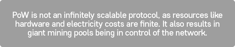 PoW is expensive. The Bitcoin network, according to a recent study published in Joule, claimed that the network currently uses about 24 TWh of energy per year— about as much as Ireland does.