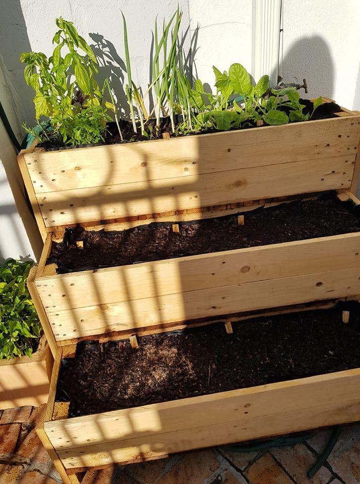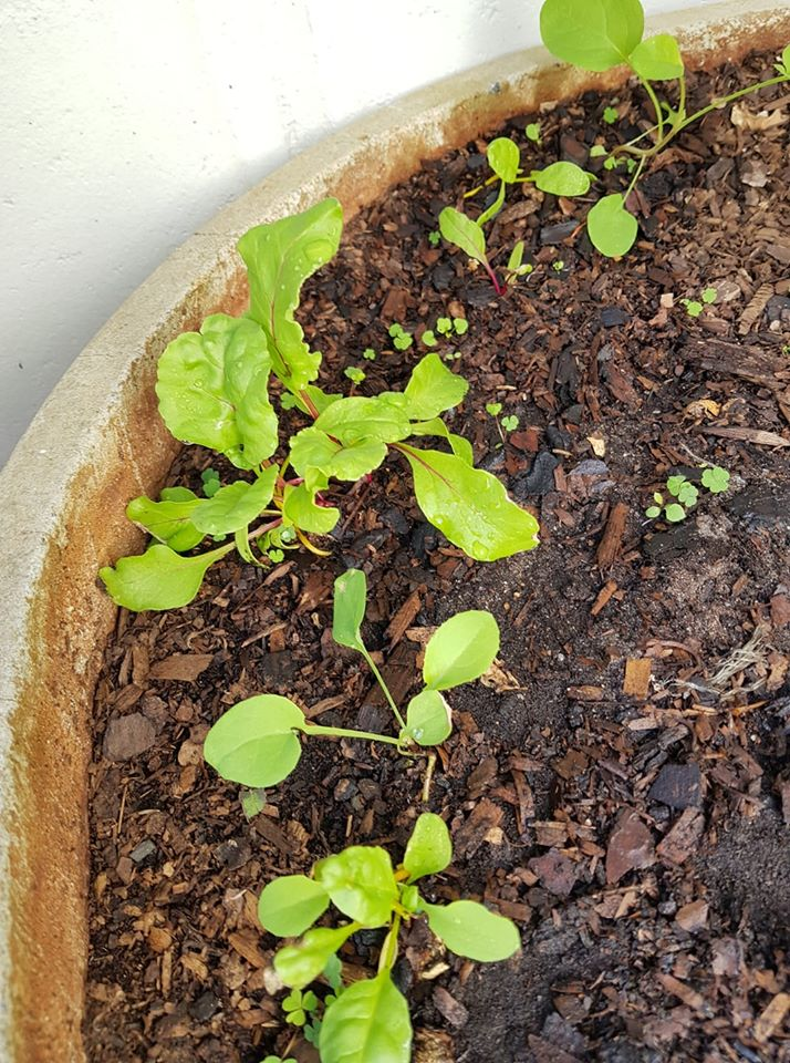 The top tier has basil, rocket, spring onions and spinach and the tiers below have seeds of beetroot,radishes lettuce, swiss chard, corriander.