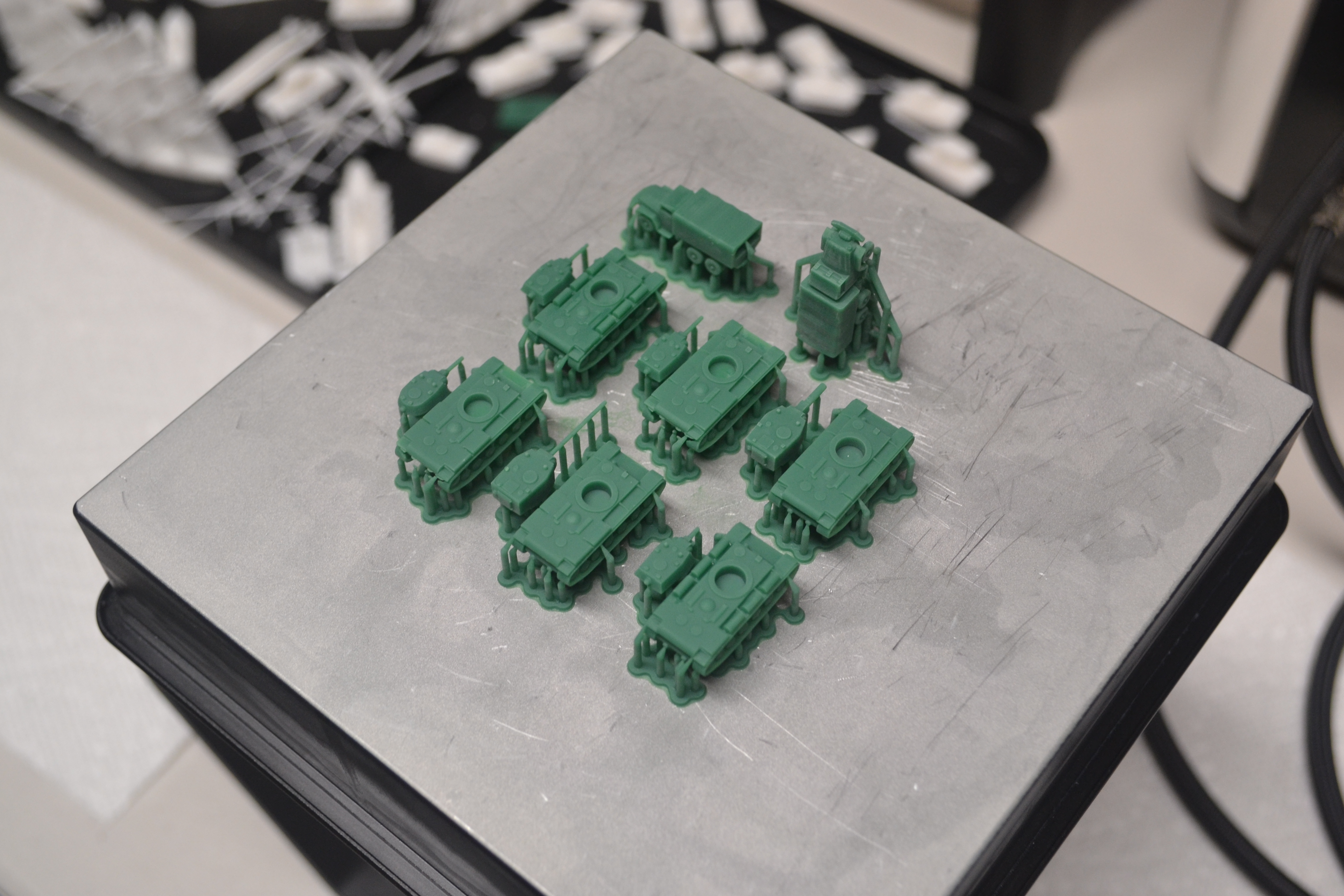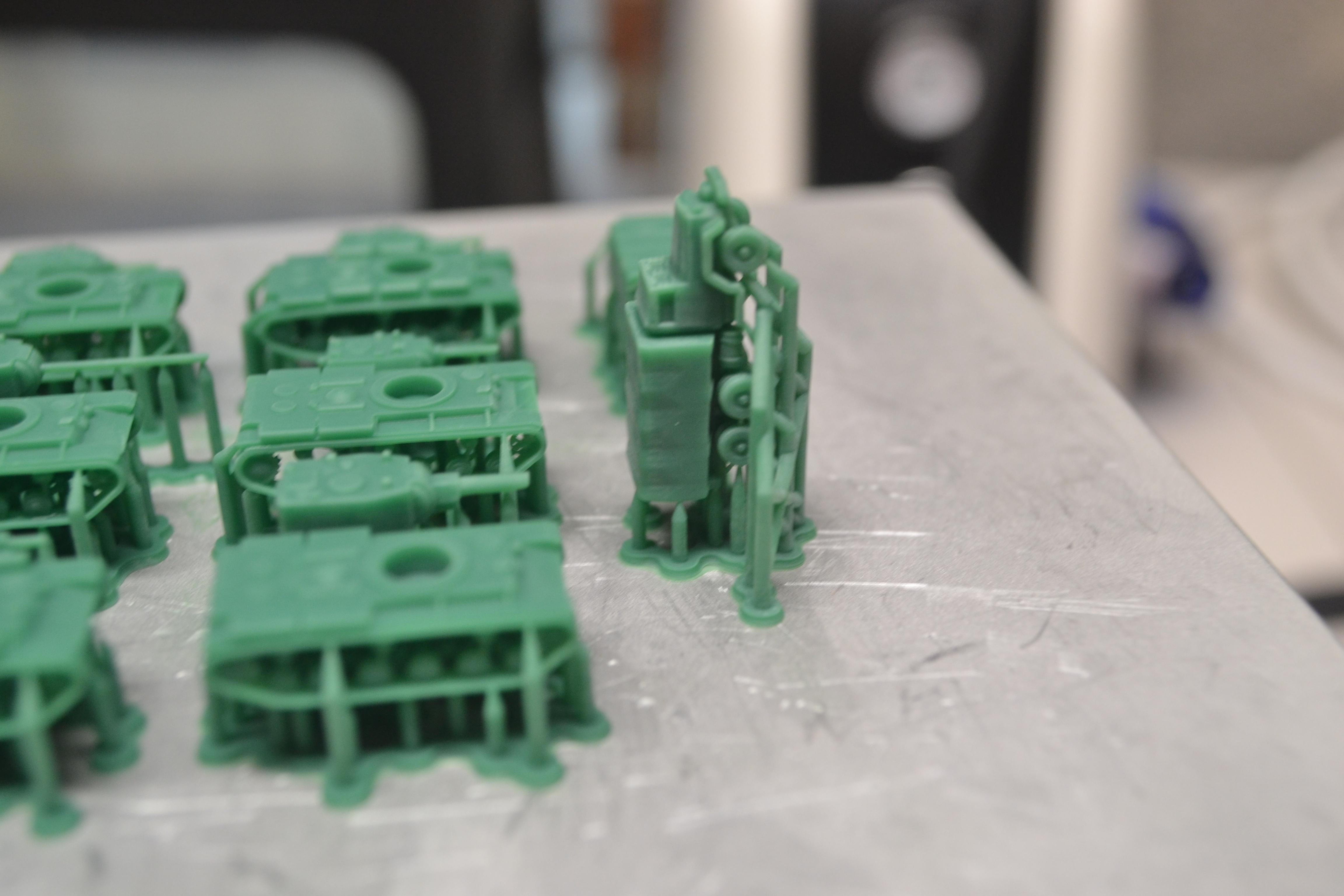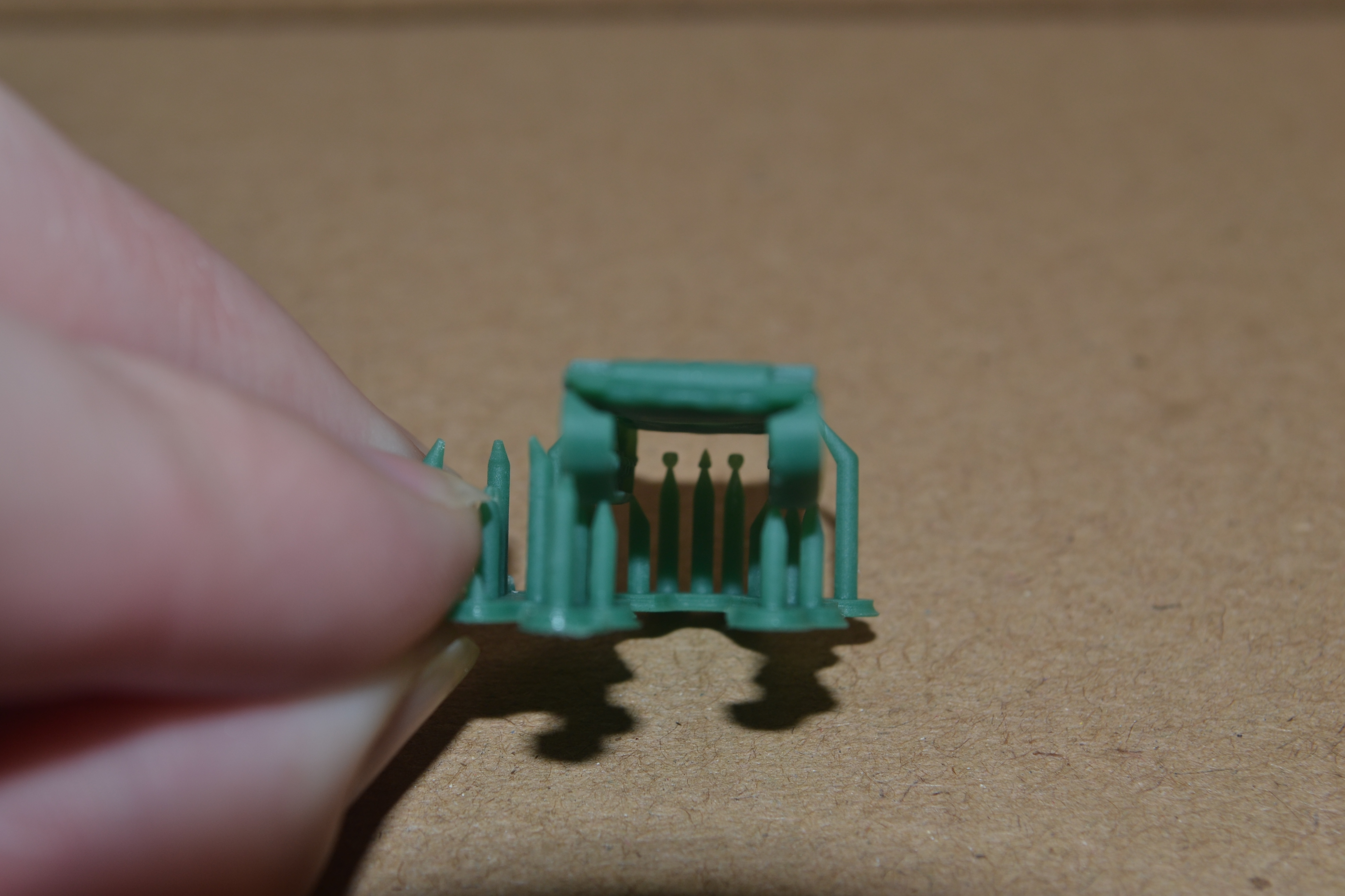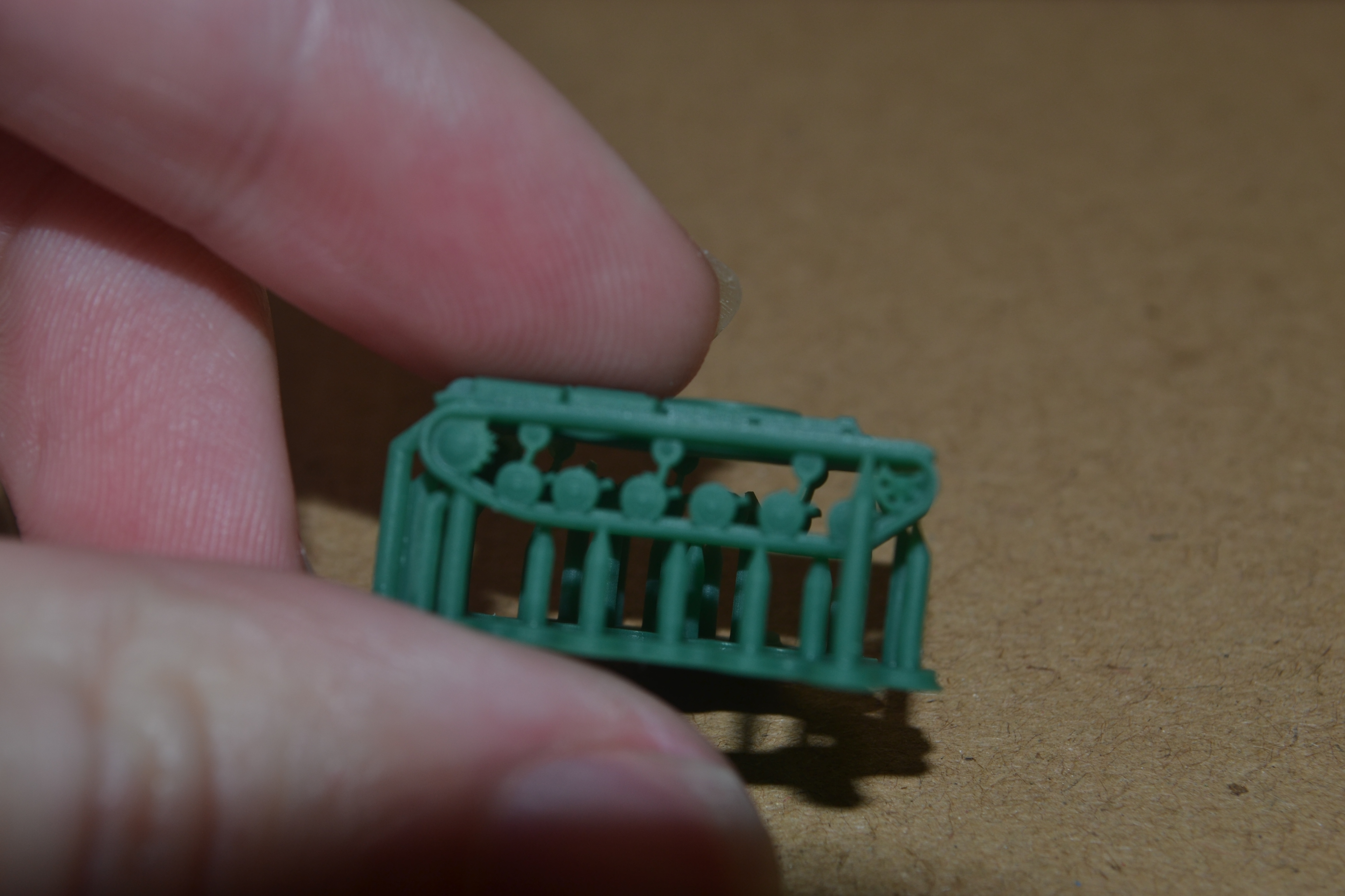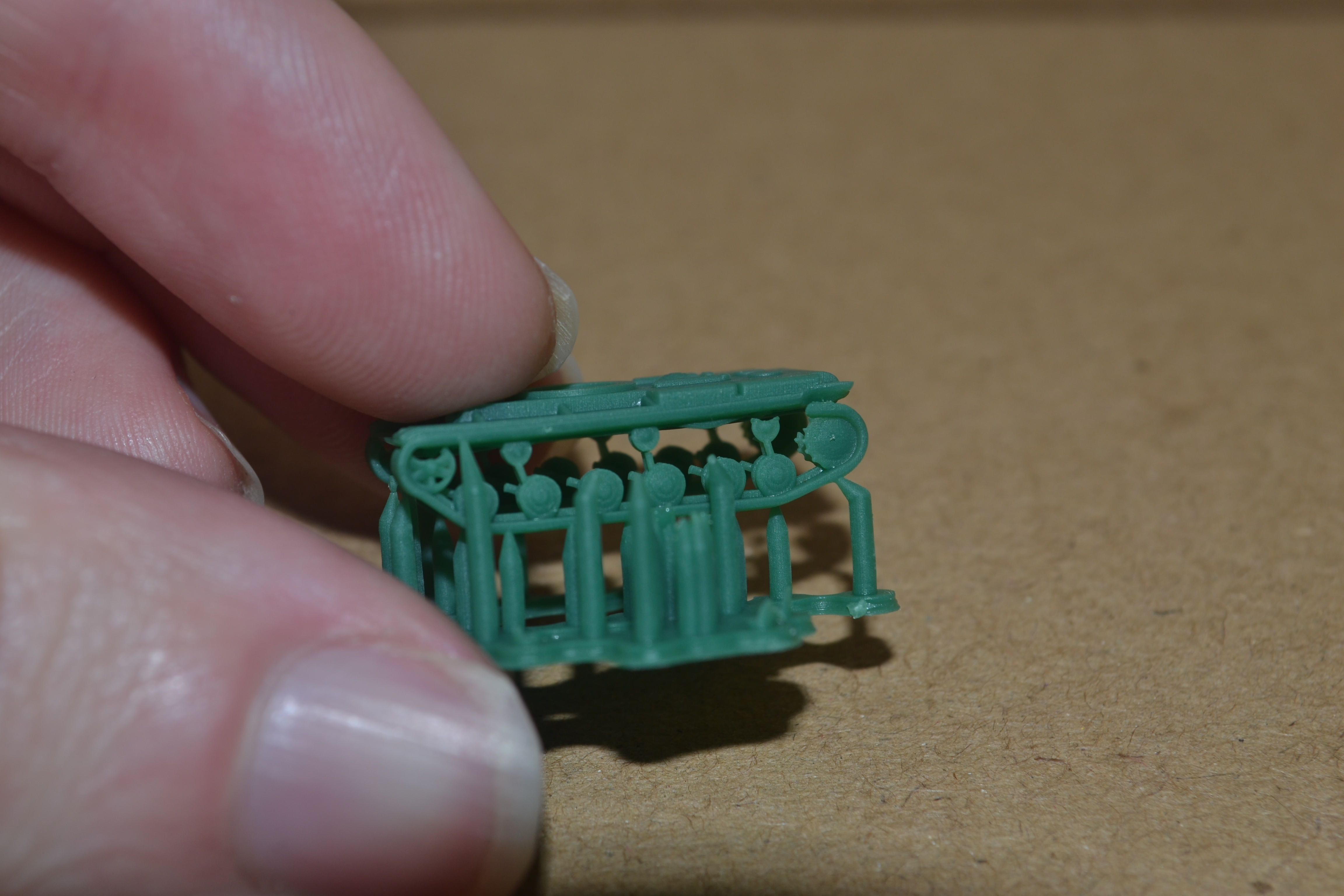Bloody hell, what happened?! Did the UV laser simply stop working for about a hundred layers in those areas?! Well, all is not lost. I had no missing turrets this time, and the trucks look superb. I'm not sure which print orientation I prefer when it comes to the results, but I definitely prefer putting it wheels-down for clean-up purposes.