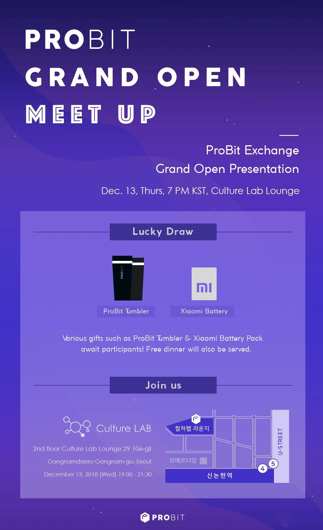 Attendees of the event will receive ProBit tumblers and Xiaomi Battery packs as gifts. Dinner will also be served.