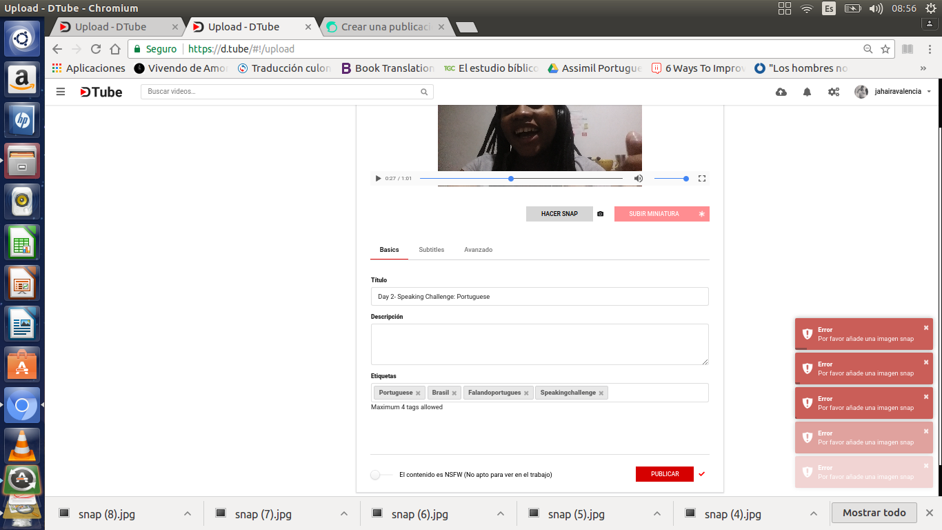 Some days ago I started to post videos on DTube because I joined a challenge called "30 Day Speaking Chellenge" to improve my speakings skills in English and Portugues - I am a Spanish Native Speaker-, but since yesterday I have been trying to post the videos of the the day two of challenge and the plataform does not allow it.