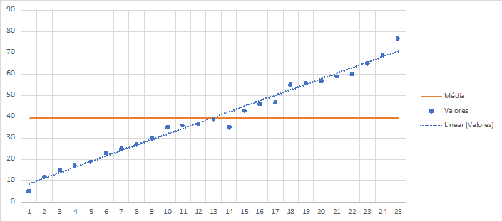 Quanto ao terceiro exemplo, perceba que os valores estão acompanhando uma tendência ascendente, por isto recomendo o uso de cálculos de tendência linear, visto que a média aritmética simples é totalmente ineficaz neste caso. A título de curiosidade, eis como ficaria o gráfico com a tendência linear do quarto exemplo:
