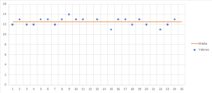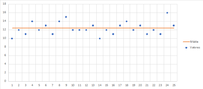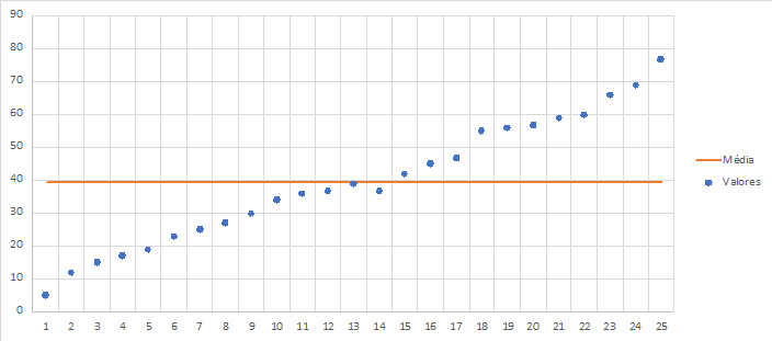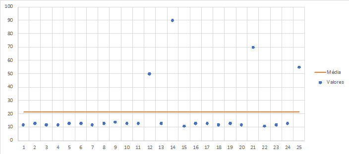 O ideal, no segundo caso, seria considerar aqueles valores muito elevados como extraordinários e tirá-los da amostra, para ter uma média mais adequada em relação aos valores comuns (ordinários), ou utilizar outro método de cálculo mais adequado para previsão de valores. Caso retirássemos os valores muito grandes na amostra, teríamos este gráfico: