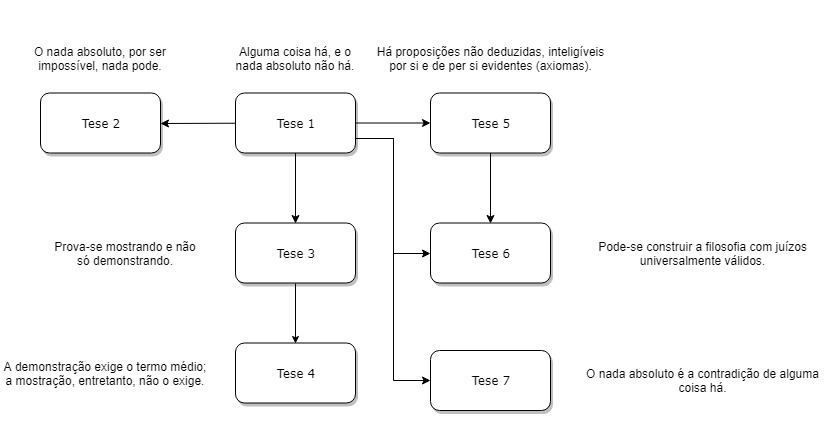 Dizer, pois, que alguma coisa há é contradizer que há o nada absoluto. Não se trata, aqui, do nada relativo, que será apresentado na tese 8, mas dum hipotético nada absoluto, que seria a ausência de qualquer coisa, em qualquer lugar.