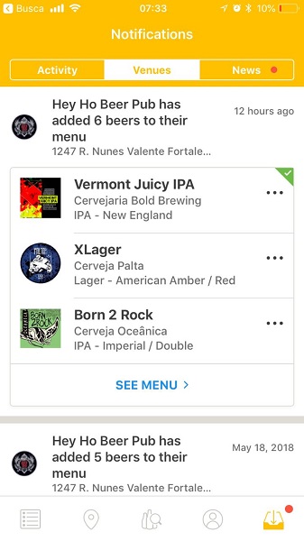 Outra funcionalidade bem legal e bastante útil do Untapped é que você pode seguir estabelecimentos e receber notificações sobre quais cervejas estão engatadas nos chopps e valores. Bacana também pra quem está viajando, pode procurar os bares pertos e já visualizar a carta de bebida.