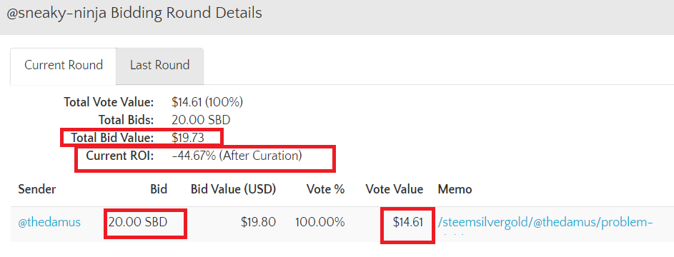 Vou mostrar para vocês com 2 fotos que tirei do sneaky-ninja há uns dias. O ROI dele é de -10%/none, ou seja, fica no mínimo em -10% e o máximo é bem alto. Muito alto mesmo, podendo chegar á mais de 100% se tiver compra de votos bem pequena. O máximo de voto atual nele é $14,31. Caso ultrapasse esse valor, o ROI fica negativo e a pessoa perde sbds investidos. Vou mostrar para vocês com 2 fotos: