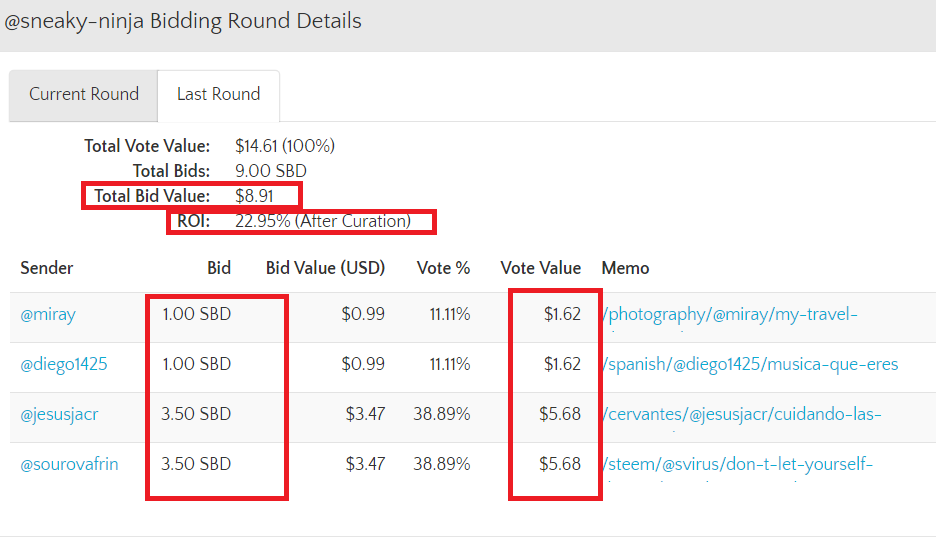 Aqui, a compra total de votos chegou em $8.91, então, o ROI ficou em 22.95%. Uma das contas que comprou 3,50 sbd em votos, receberá 22,95% , que no total seu voto recebido valerá $5,68.