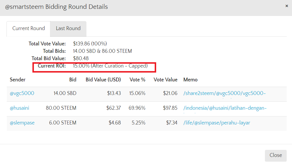 Ele possui um valor de voto de $139.86, o ROI dele, que é o retorno sobre o investimento fica no mínimo em 10% e no máximo em 15%. Para ficar no máximo(15%) é necessário que o tanto de voto comprado não fique próximo á $139,86. Agora por exemplo, como está em $80.48, o ROI ainda é 15%, como vocês podem ver nessa foto: