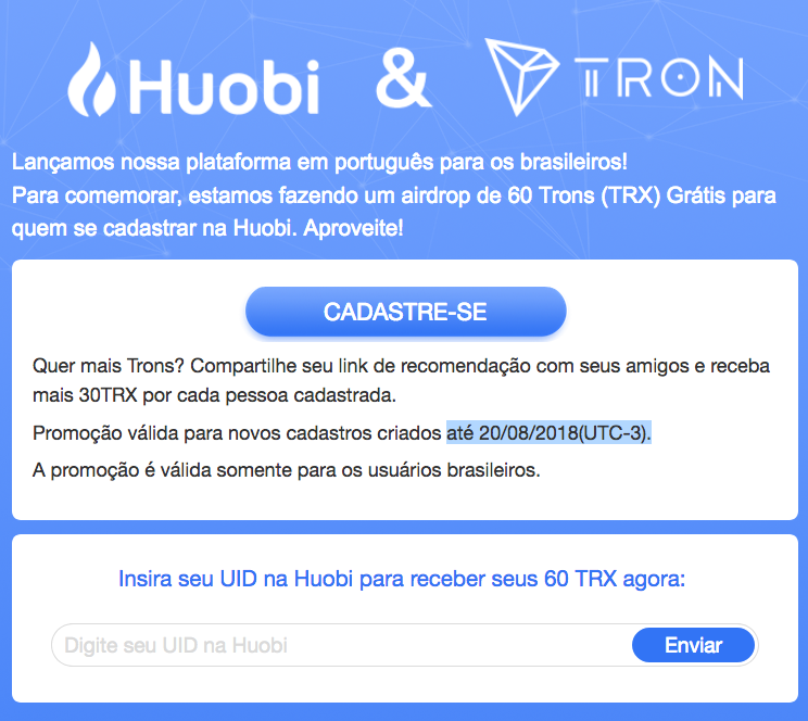 A Huobi acaba de chegar ao Brasil e como forma de incentivo eles estão distribuindo 60 TRONs para todos os novos cadastros feitos a partir do brasil até dia 20/08/2018.