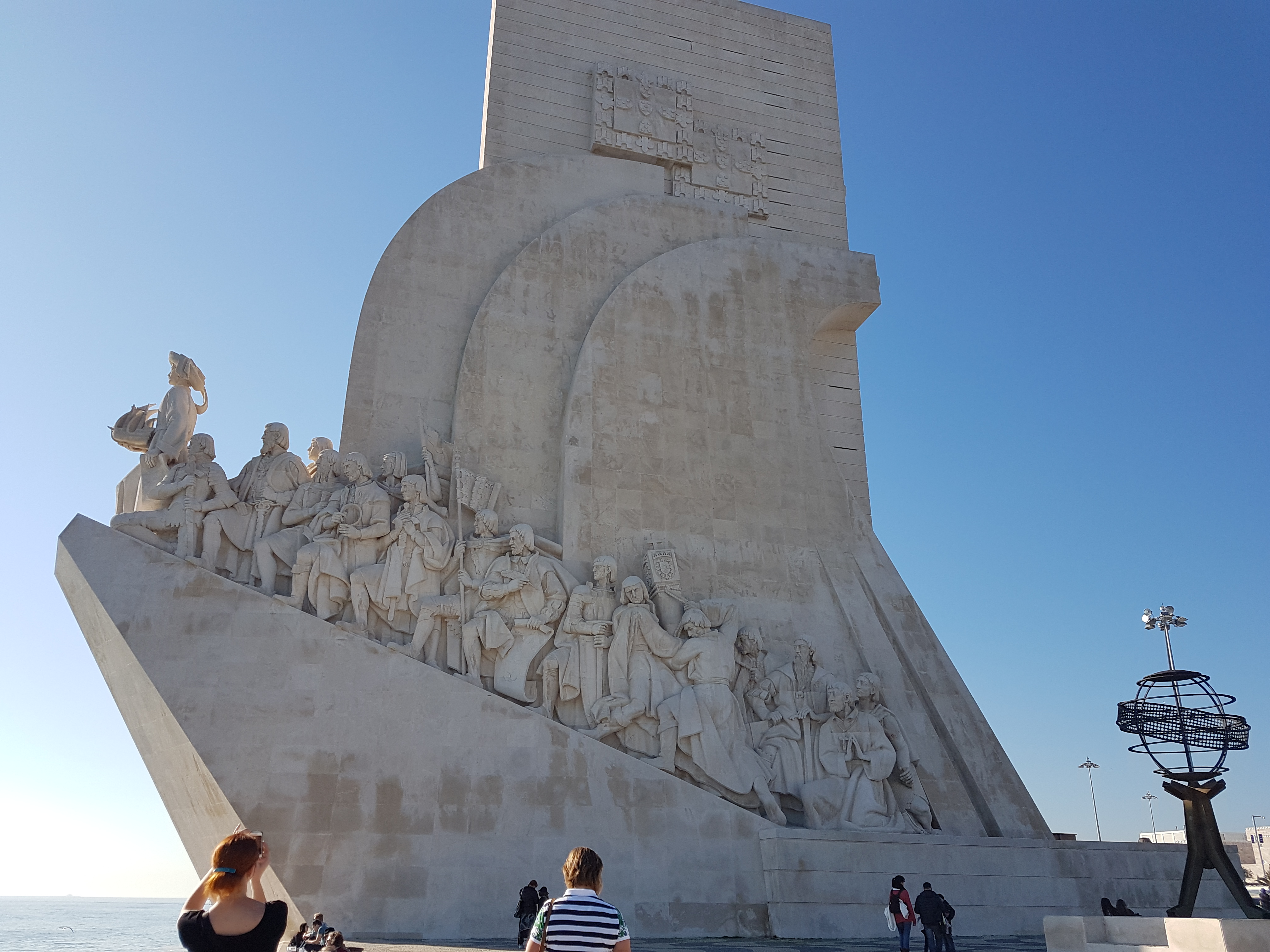 De lá, foi uma boa caminhada até o Padrão dos Descobrimentos. É um monumento mais novo, homenageando com enorme elegância 28 (!) grandes navegadores portugueses. à sua frente, um enorme mosaico do mapa-mundi mostra as principais conquistas. Tão belo que é realmente difícil obter uma foto justa, até porque os navegadores estão divididos entre os dois lados do monumento. Isso foi o melhor que eu pude fazer: