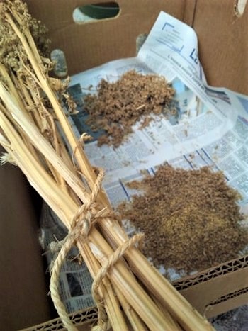 J'ai laissé tout l'hiver le quinoa à sécher "la tête en bas" au dessus d'un carton avec du papier journal.