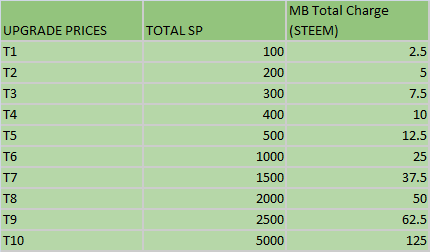 This means that if you achieved T4 with upvotes and a 2 STEEM sub, to get to T5 using the minnowbooster rate would cost you 2.5 STEEM.