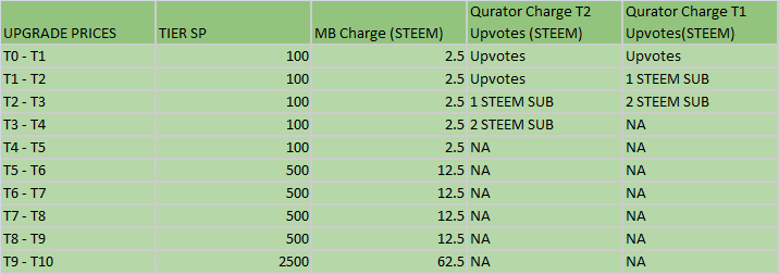 Similarly if you could only reach Tier 3 with upvotes and a 2 STEEM sub, the upgrade to T4 would now cost you 2.5 STEEM.