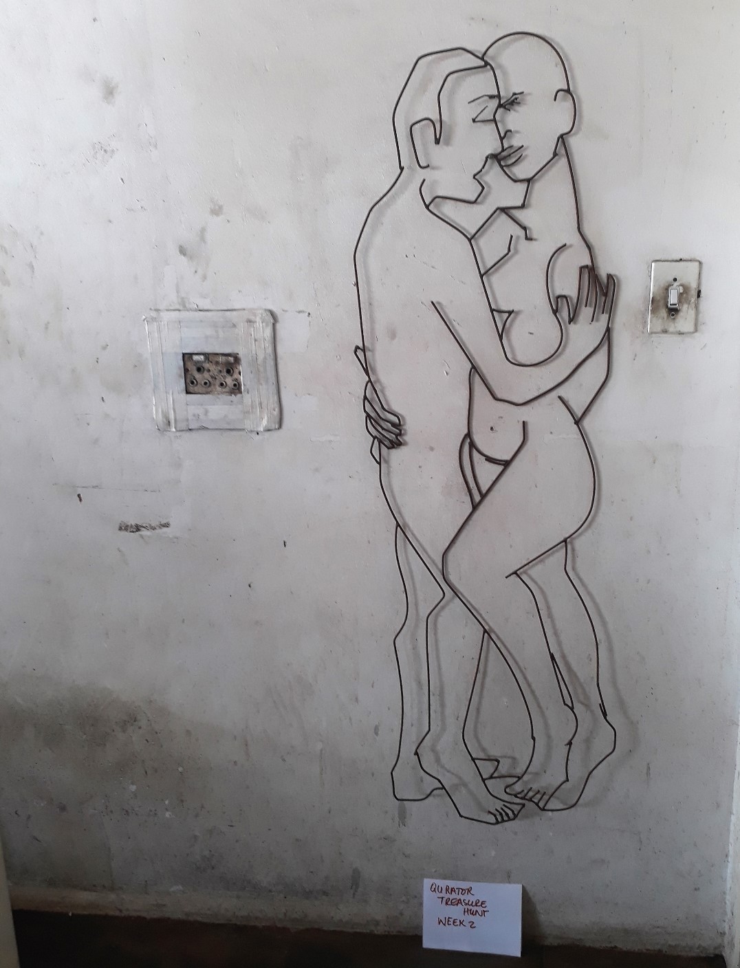 A wire sculpture mounted on a wall