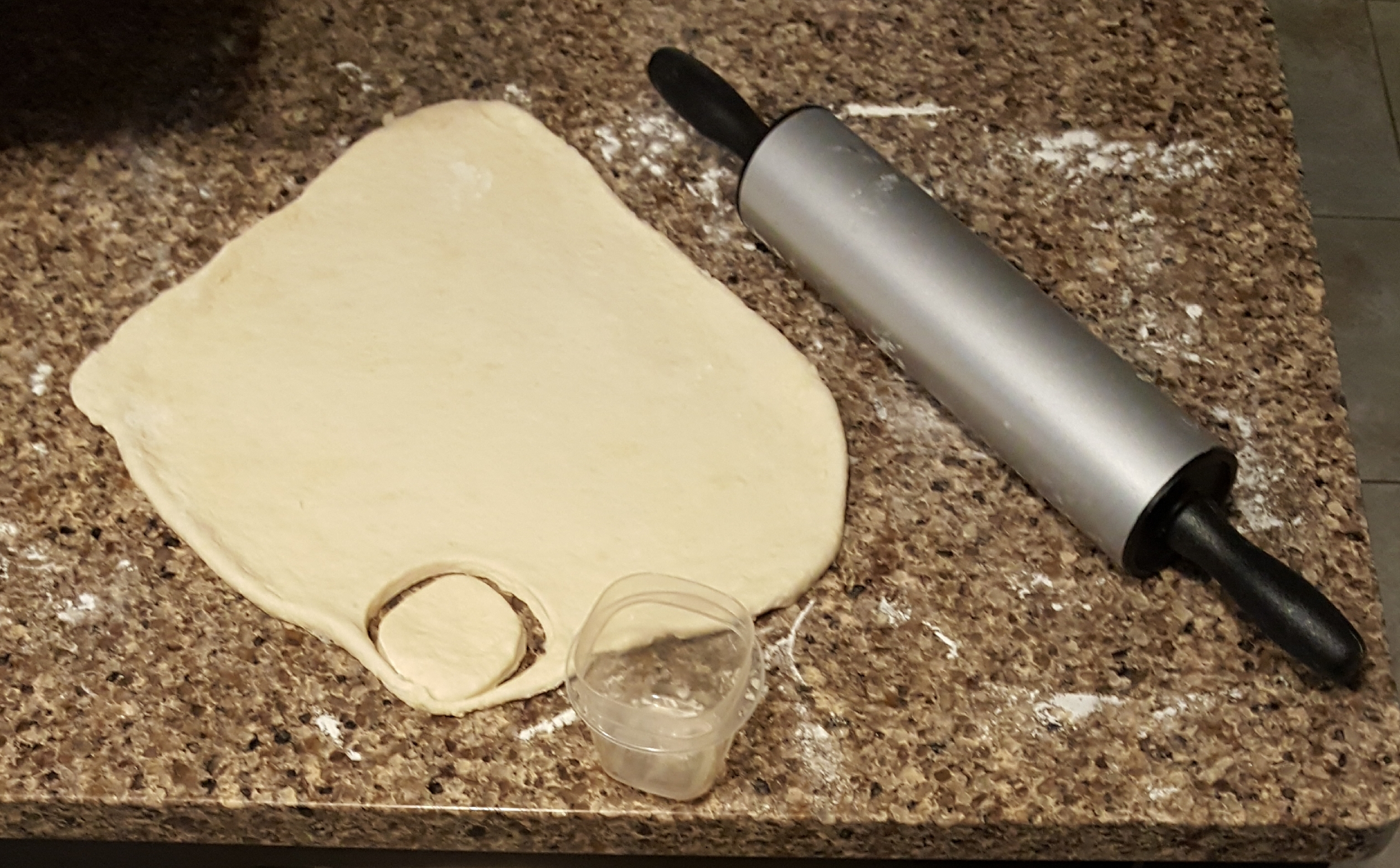 After kneeding the dough just a few quick times and rolling out I used a square shaped container to make each biscuit. Then when there are only outlines left just hand shape the rest of the dough into drunk looking biscuits.