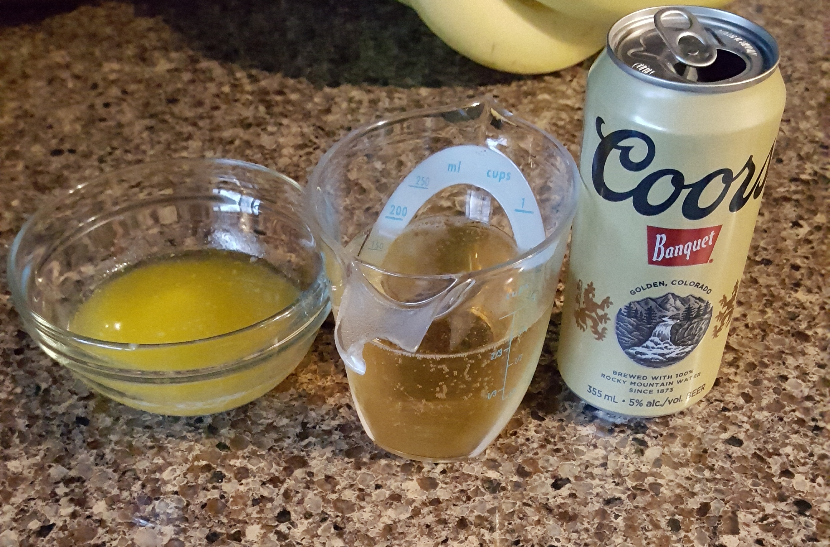 Self explanitory picture above, 5 tablespoons melted butter and 3/4 cup of beer in a broken measuring cup.