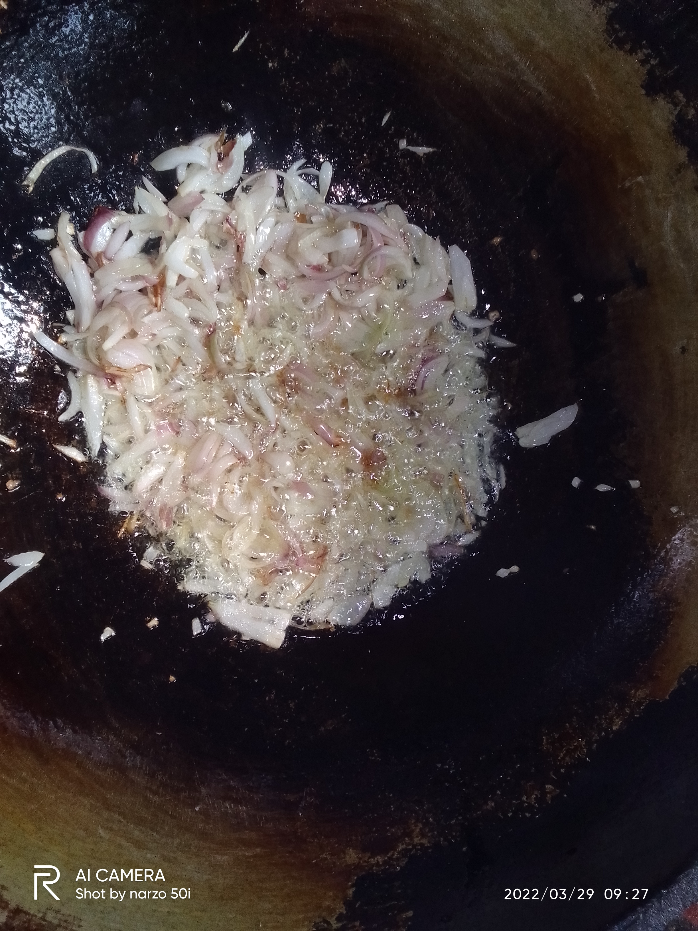 তেল গরম হয়ে গেলে পেঁয়াজ কুঁচি দিয়ে দিতে হবে।