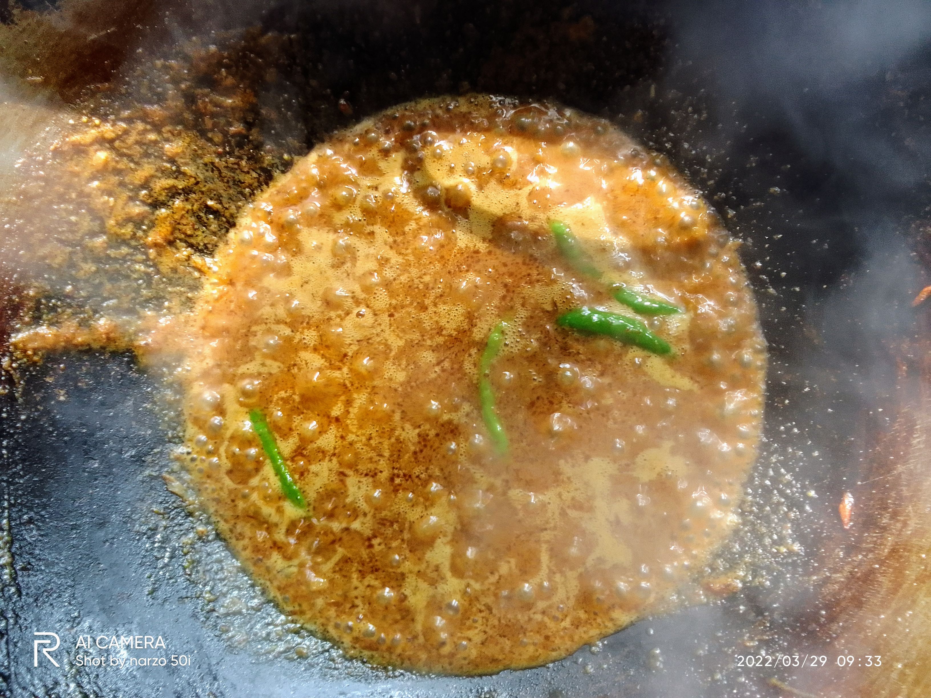 কিছুক্ষণ কষিয়ে নেওয়ার পর এ সরিষা বেঁটে গুঁড়া করে দিয়ে দিতে হবে এবং কাঁচামরিচ দিয়ে দিতে হবে।