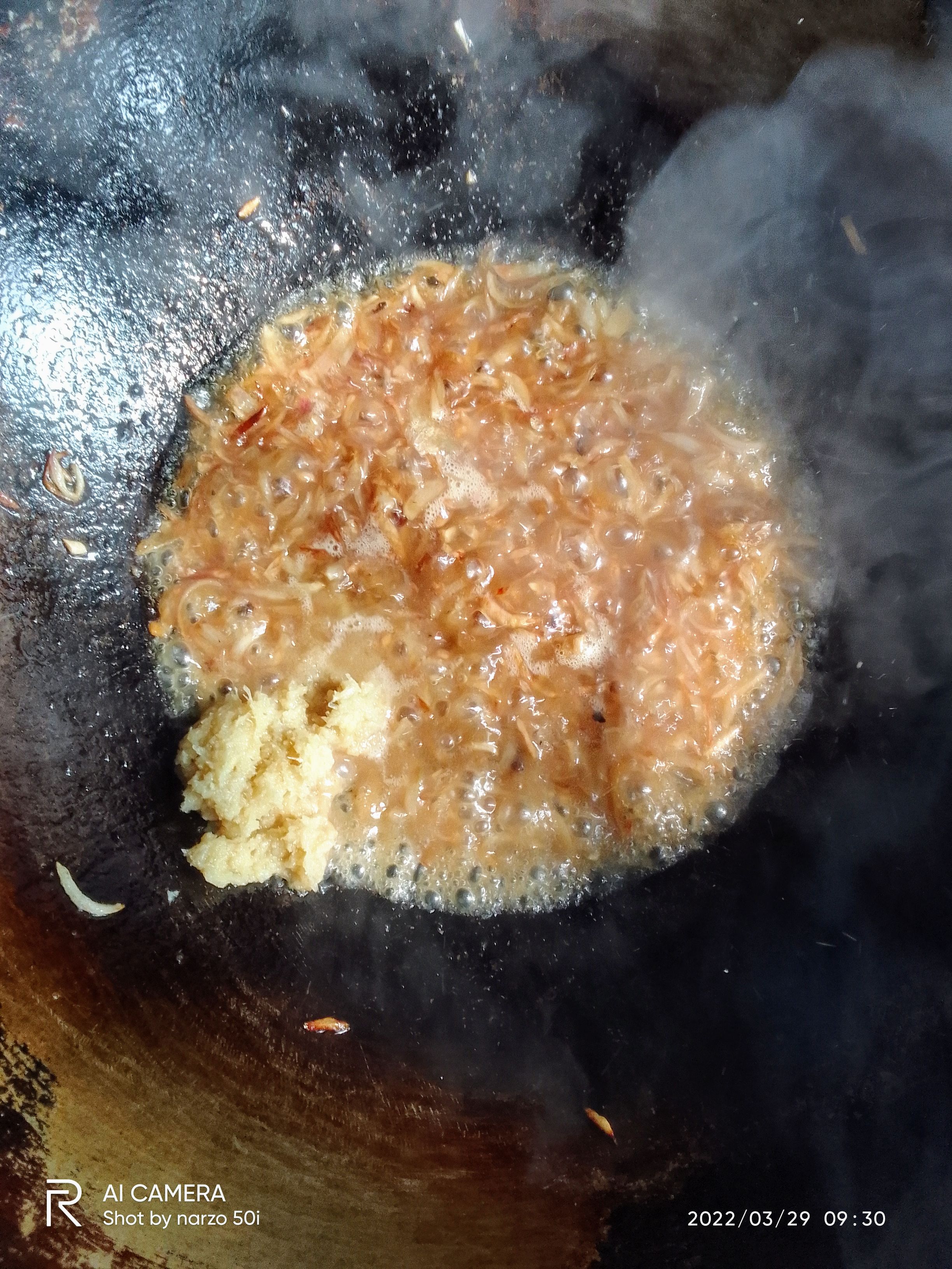 পেঁয়াজ বাদামী রঙের হয়ে গেলে এর মধ্যে আদা বাটা,রসুন বাটা, দিয়ে দিতে হবে।