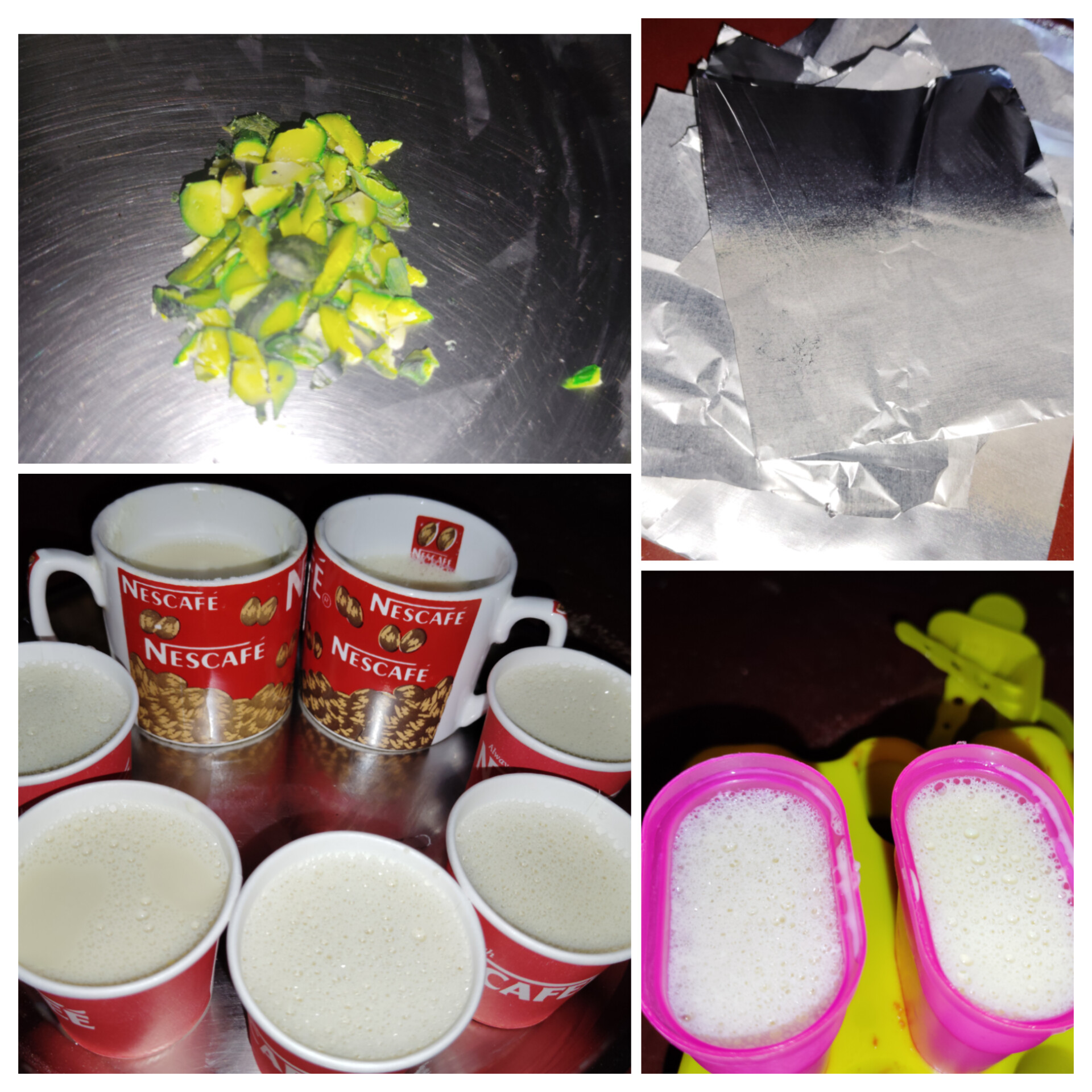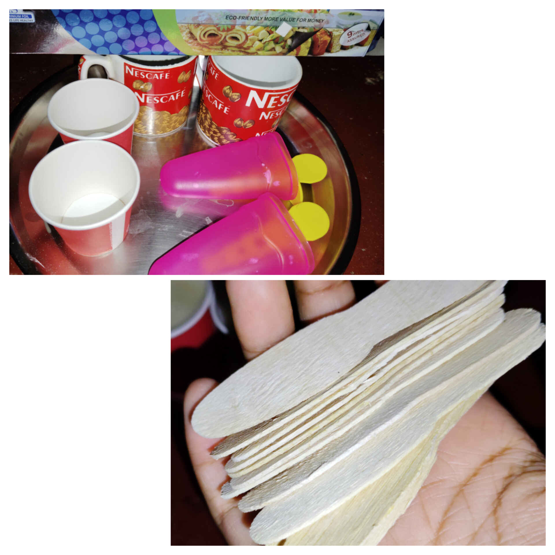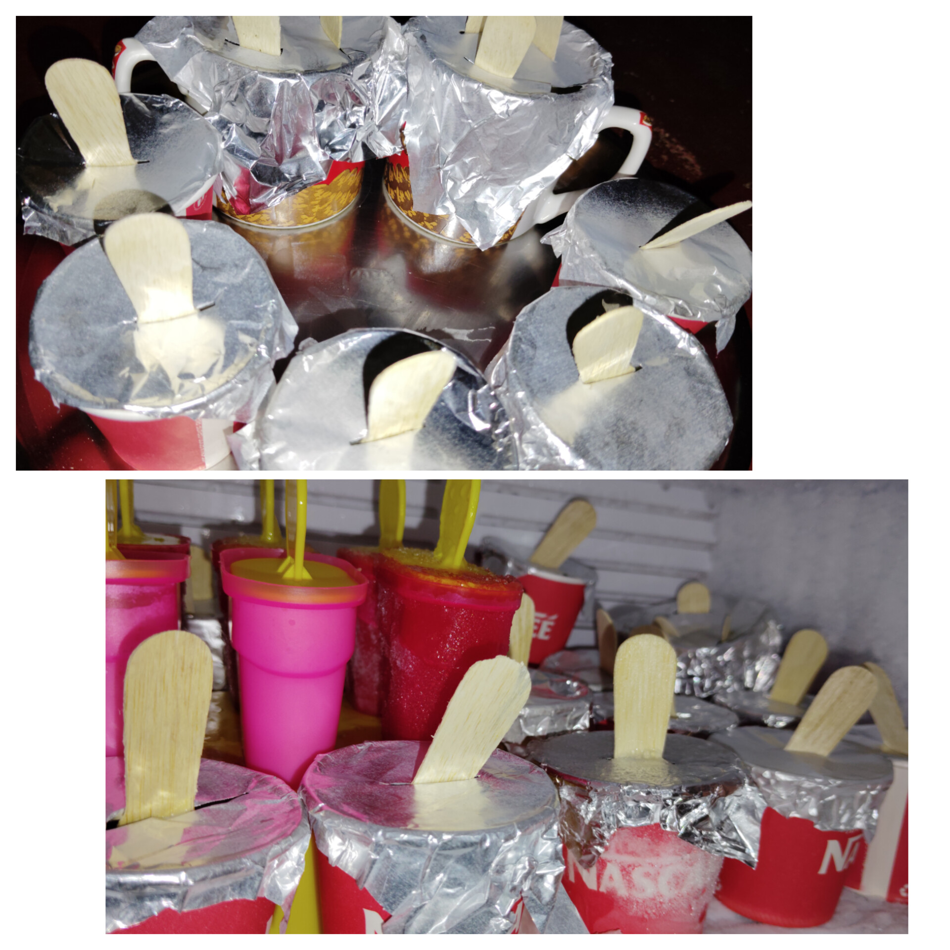 এরপর ফয়েল পেপার দিয়ে প্রত্যেকটার মুখ আটকে দিয়ে এর মধ্যে একটি করে চামচ দিয়ে দিলাম। তারপর ডিপ ফ্রিজে দিয়ে ১৮ ঘন্টা জমার জন্য অপেক্ষা করলাম।