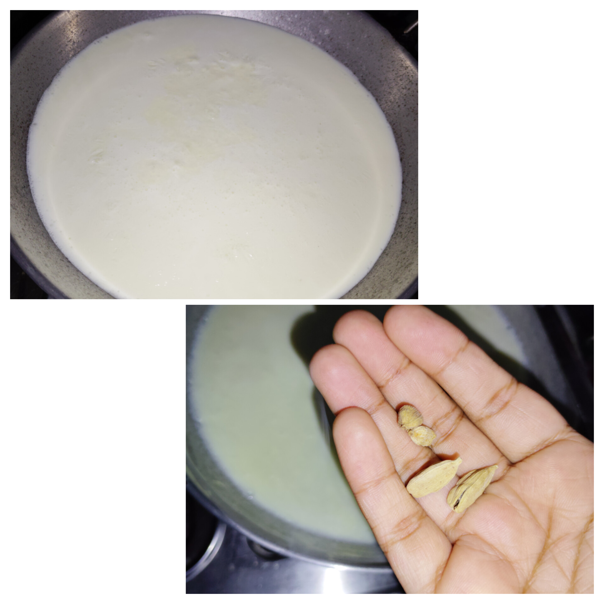 এরপর একটি কড়াইতে সম্পূর্ণ দুধ ঢেলে দিয়ে সেটাকে গরম করতে দিলাম। একবার ফুটে আসলে তাতে দিয়ে দিলাম এলাচ। তারপর আবারও বেশ কিছুক্ষণ ফুটিয়ে নিলাম।