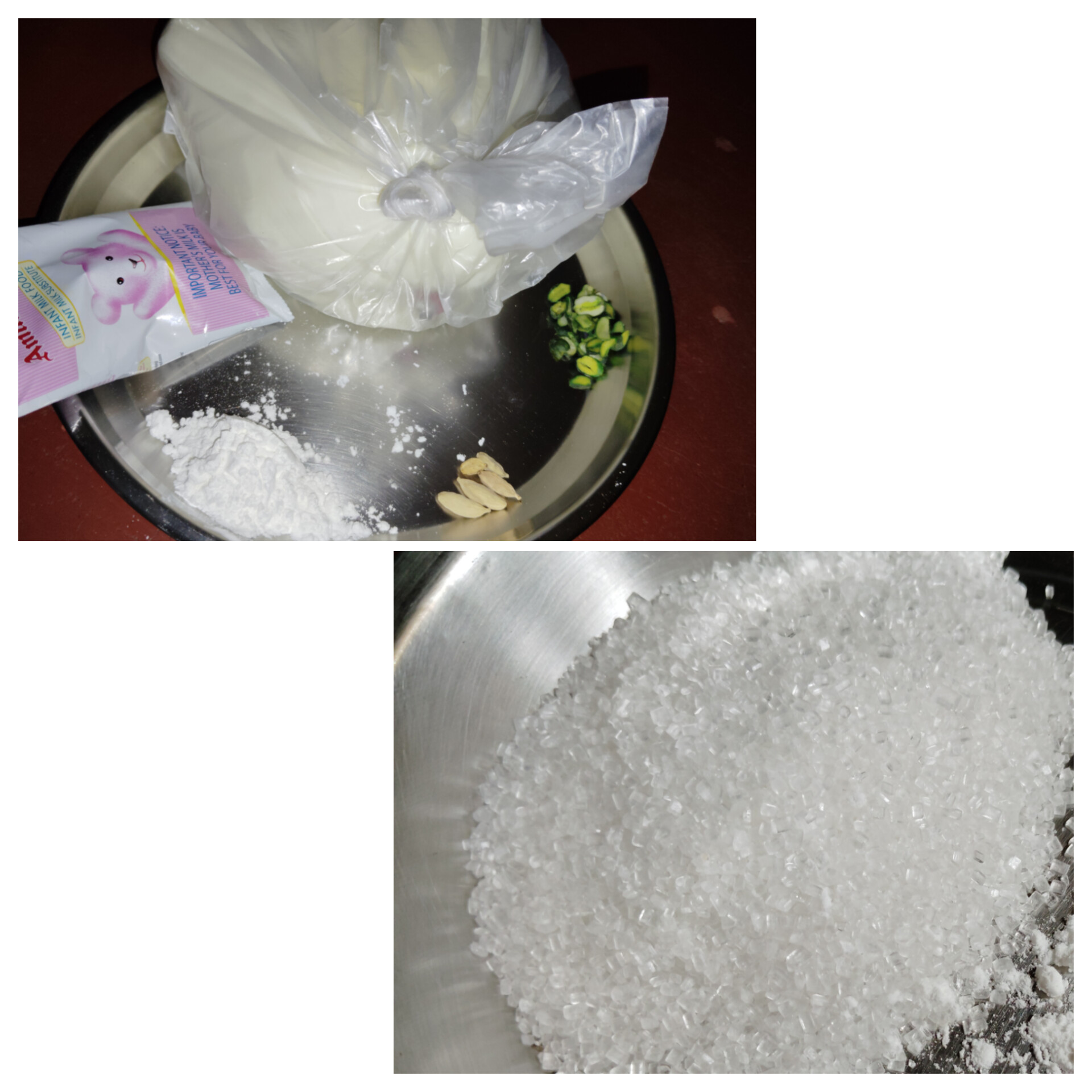 প্রথমেই নিয়ে নিয়েছি আমার প্রয়োজনীয় উপকরণ গুলি - দুধ, আমুল দুধ, কনফ্লাওয়ার, চিনি, পেস্তা বাদাম আর এলাচ।