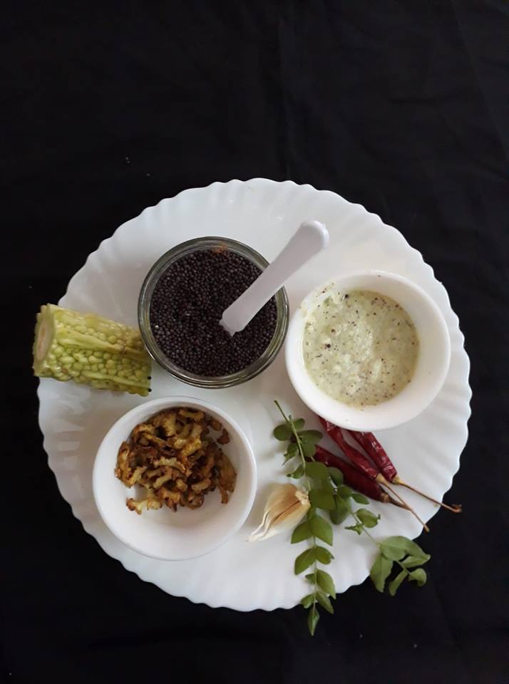 Cut the bitter gourd into thin slices. Marinate with salt and turmeric. Shallow fry it. Make a paste of items 3 to 8. Put it into a bowl, add the fried pieces, and mix both. Garnish with coconut oil, mustard, curry leaf and red chili. Transfer the garnished items into the bowl.