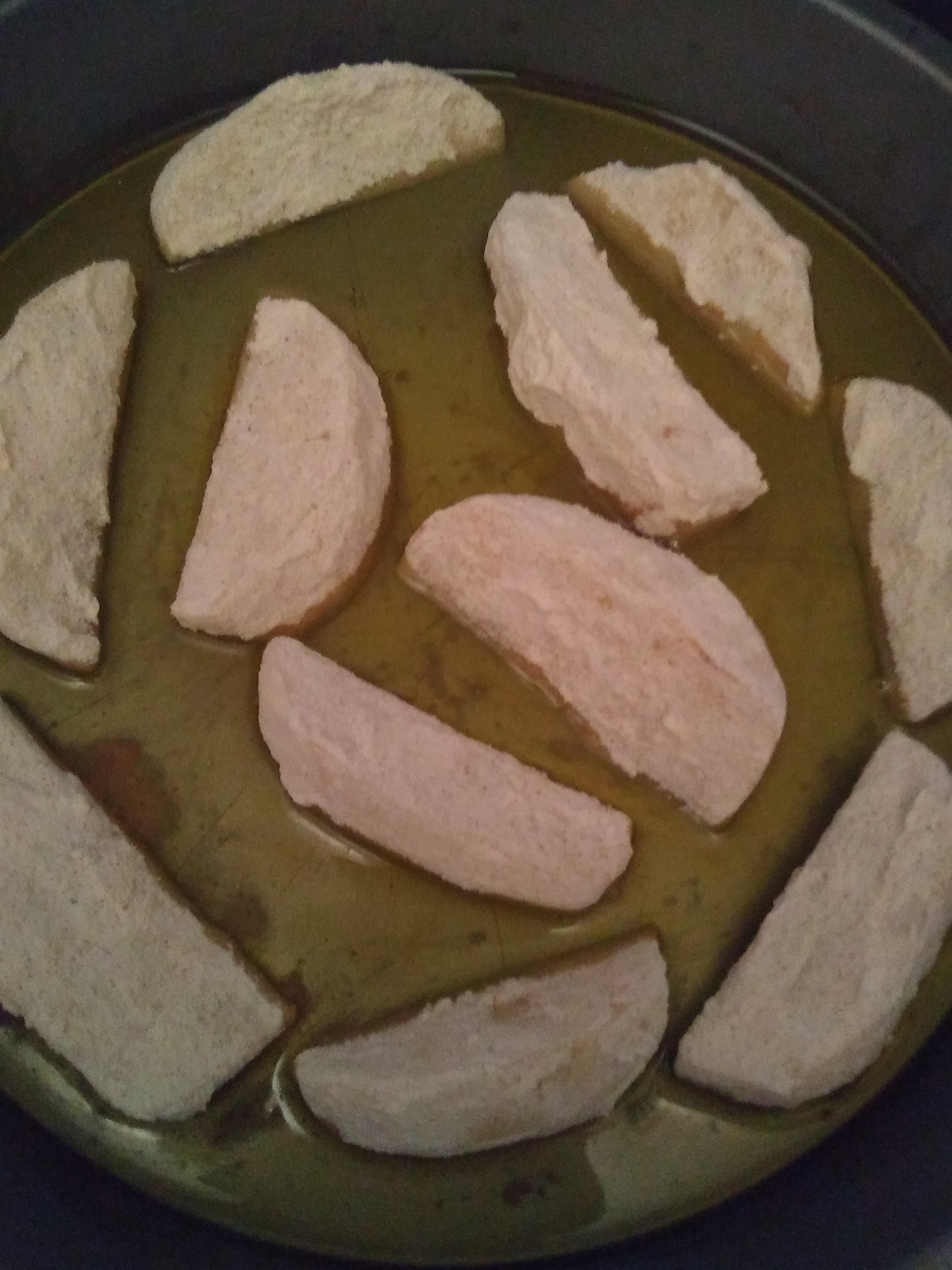 Coat in flour with salt and spices mixed in. I used two tablespoons of salt to 1 1/2 cup flour. The only spices I used were garlic and cayenne and it was delicious.