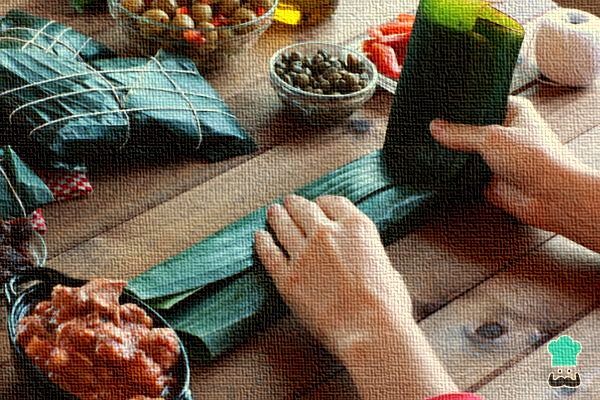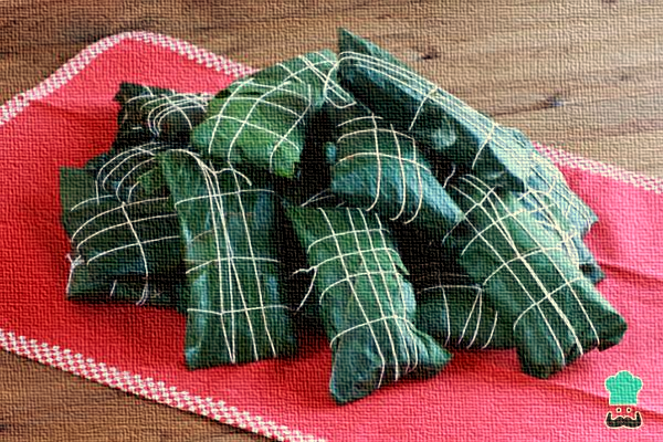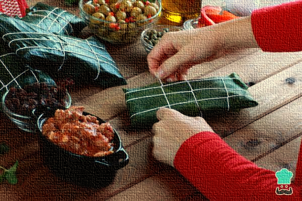 8.¬_ Amarra las hallacas haciendo un nudo con forma de cuadrícula tal y como puedes observar en la fotografía.