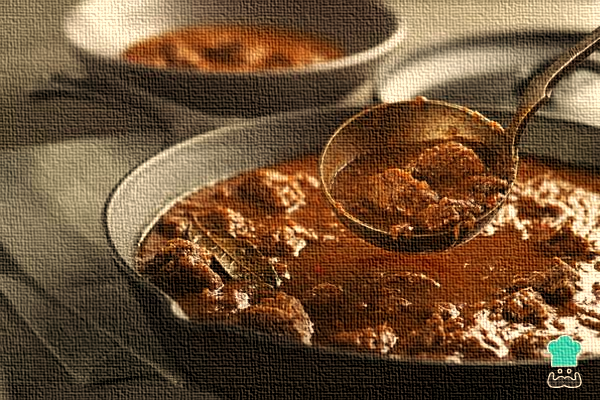 3.¬_ Pon a sofreír la cebolla, las alcaparras, el ají dulce, el pimentón y el ajoporro en una olla muy grande. Agrega las carnes del guiso, así como el papelón, el vinagre y el vino, y pon todo a hervir en agua durante al menos unas 2 horas para que los sabores se concentren bien. Salpimienta al gusto. Cuando la cocción esté acabando, mezcla la harina de maíz con agua y viértela en la preparación para que espese.
