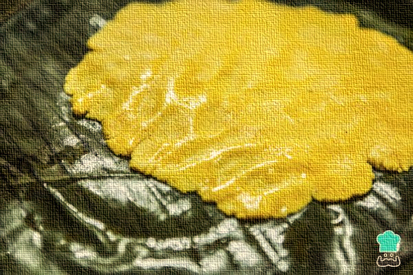 5._ Una vez tengas listos el guiso y la masa, ¡es hora de armar las hallacas! Toma una hoja de plátano grande y esparce en ella una cucharadita de aceite de onoto. Ahora, extiende una bolita de la masa de la hallaca hasta que te quede delgada. El grosor de la hallaca depende del gusto de cada persona, pero te recomendamos que no queden tan gruesas o el sabor del relleno se perderá.