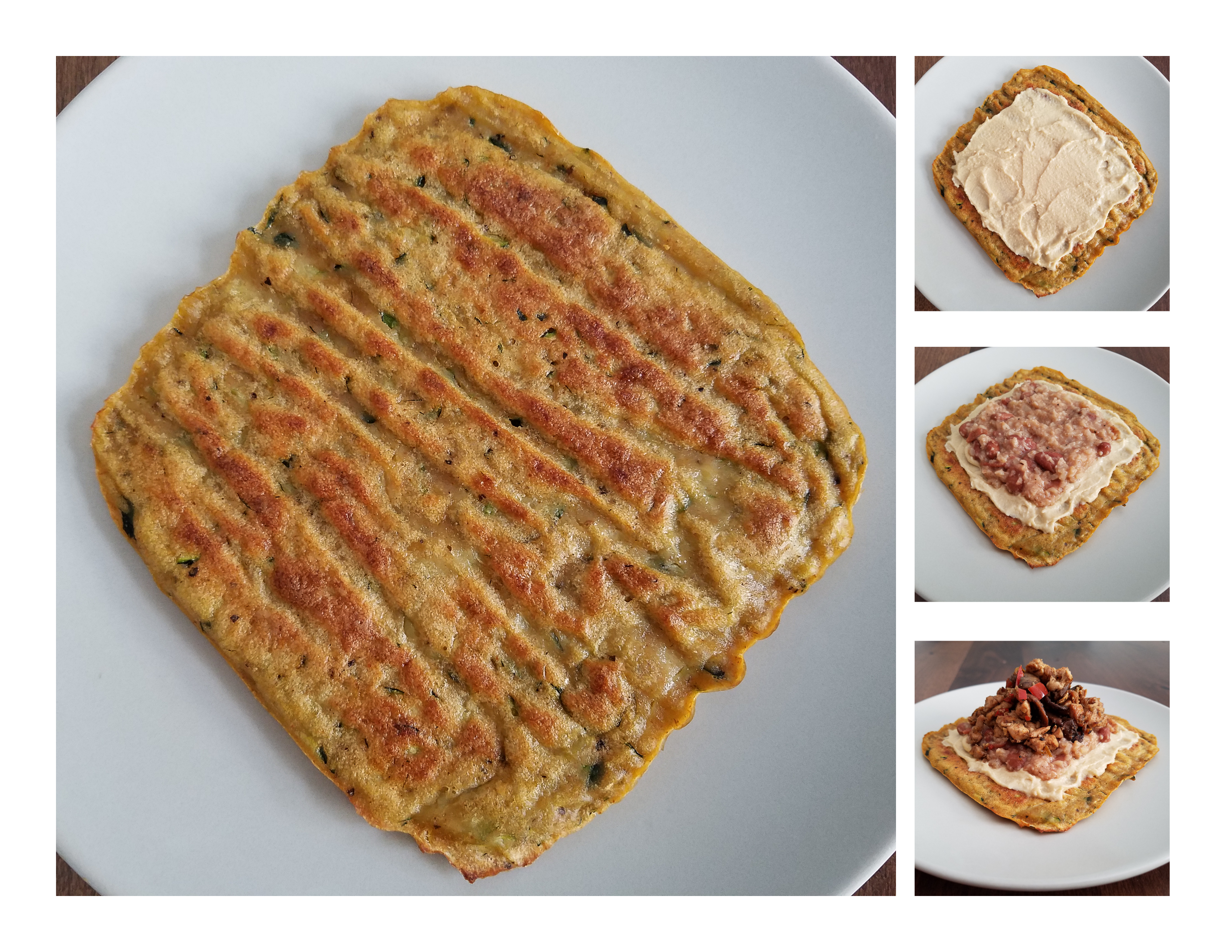 1 - Heat up your zucchitilla in a pan and then add a thin layer of hummus (original by Sabra works best or if you know of a comparable recipe, please share in the comments below)