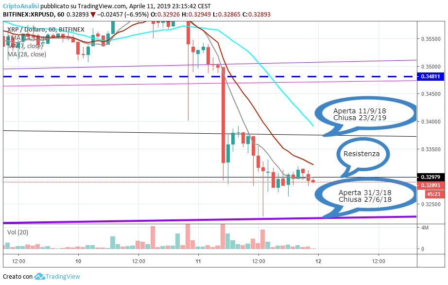 Oggi, giovedi' 11 Aprile, abbiamo vissuto una retrocessione del mercato e in questo articolo andro' ad analizzare su base oraria il cambio XRP/USD.