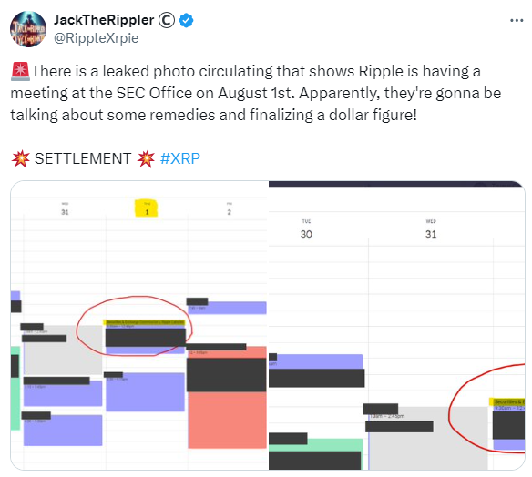 A leaked image, shared by cryptocurrency expert Jack the Ripple, suggests the SEC and Ripple might meet on August 1st.