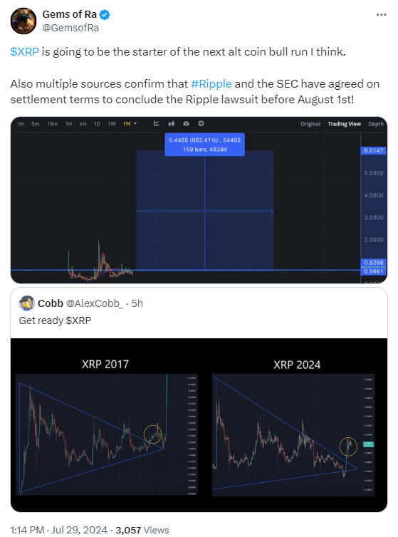 GemsofRa predicts $XRP will ignite the next altcoin bull run. Multiple sources confirm Ripple-SEC settlement before August 1st.