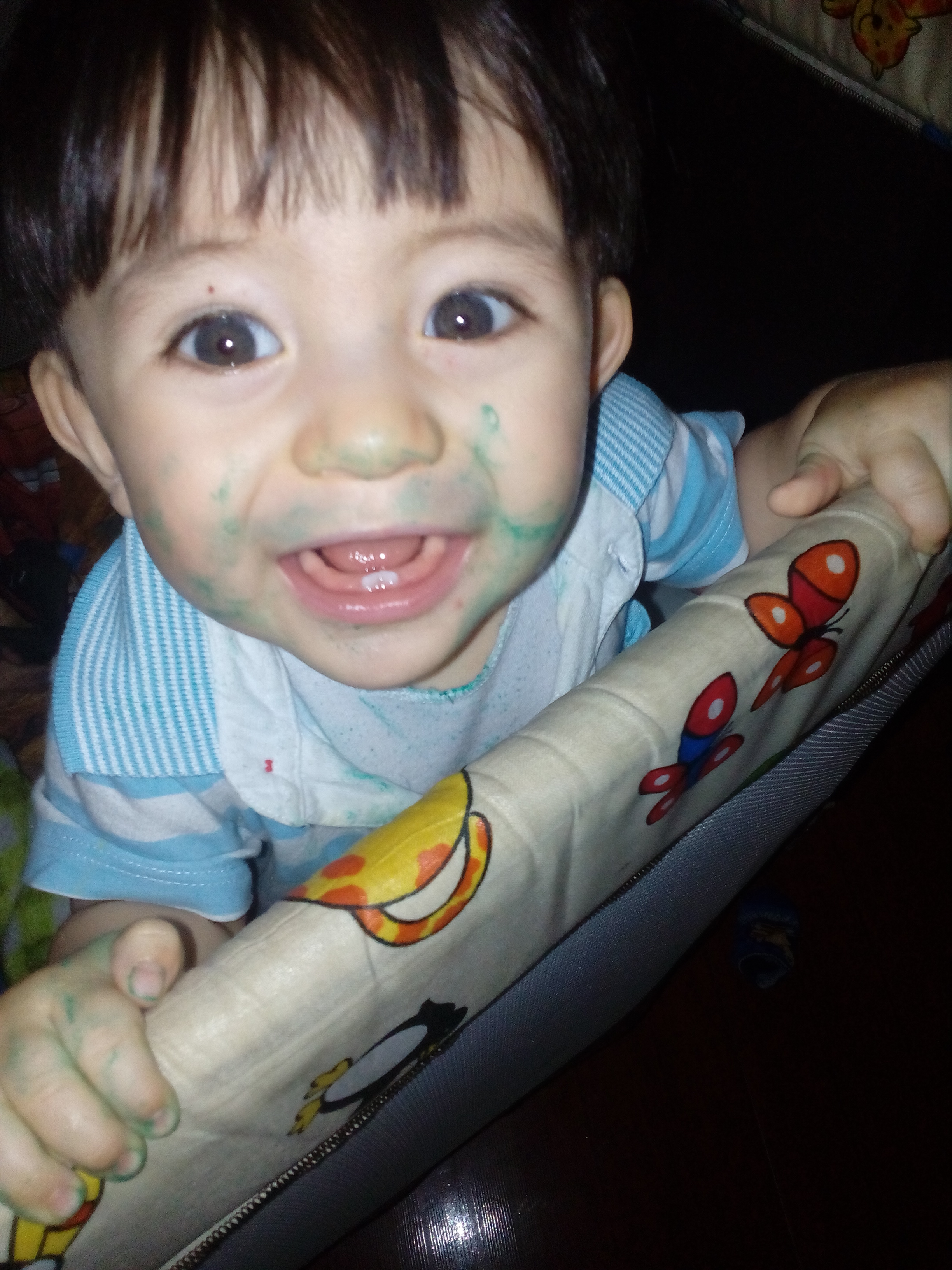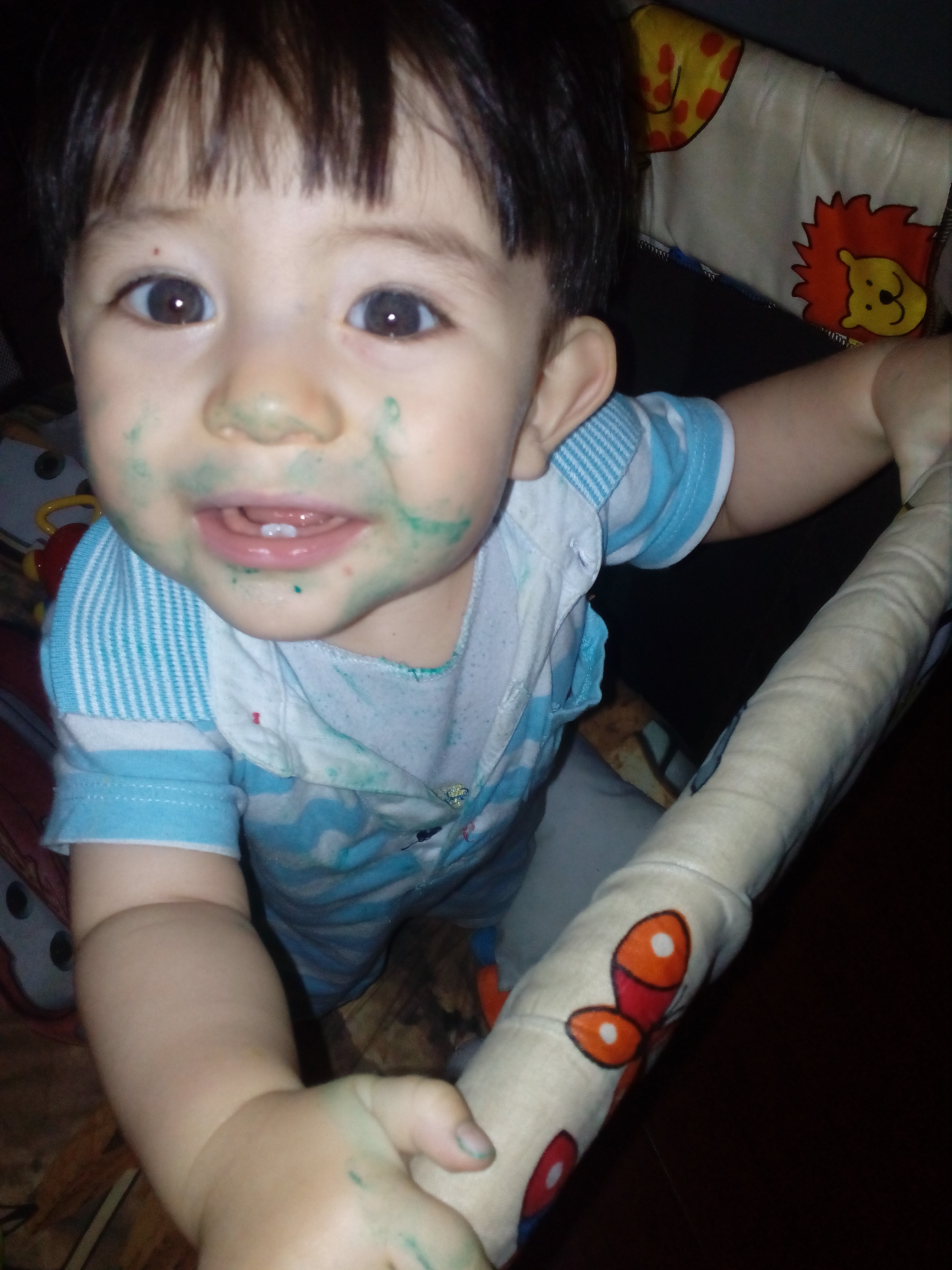 este es un dia maravilloso un dia para admirar todas las bendiciones que nos trae dios,los hijos son parte esencial de nosotros,son aquellos que nos impulsan a ser mejores cada dia y nos hacen sonreir con sus travesuras,como es el caso de este pequeñin travieso que mientras mama hiba a alistarle el agua para que tomara su ducha el alcanzo algo con pintura y decidio hacer una obra de arte en su carita