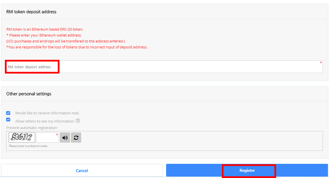 ○ Write down your information. Please also enter your Ethereum wallet address to trade RM tokens!