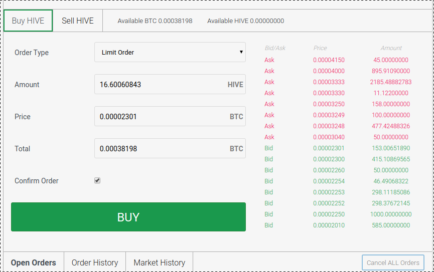 Hier kann man ebenfalls durch einen Klick auf einen "Bid-Preis" und danach auf "Available BTC 0.0003......", in Windeseile die Felder ausfüllen und mit dem Klick auf den grünen "Buy - Knopf" den Auftrag freigeben.